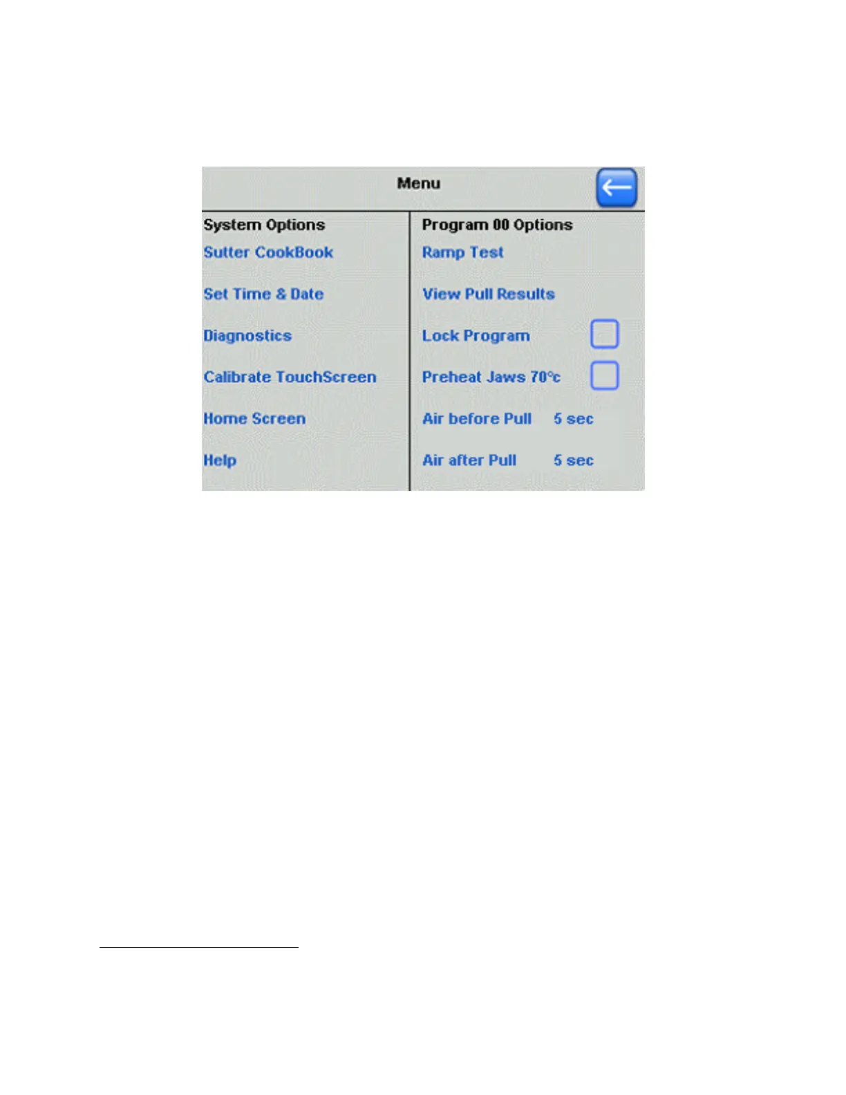 NOTE: The program option “Preheat Jaws 70˚C”in the Menu screen is associated with the Thermolock™ feature, and exists only in P-1000