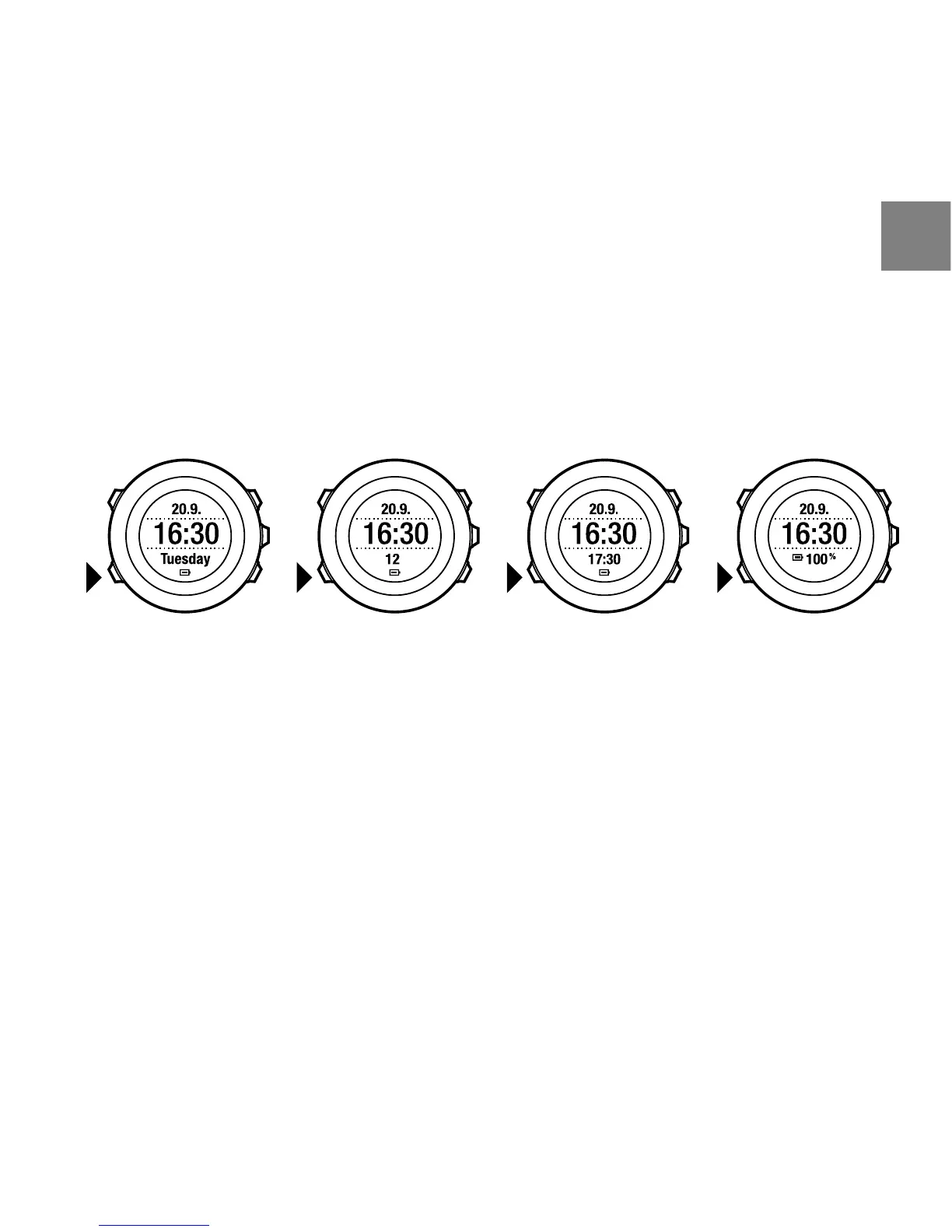 bottom row: toggle between weekday, seconds, dual time and battery level