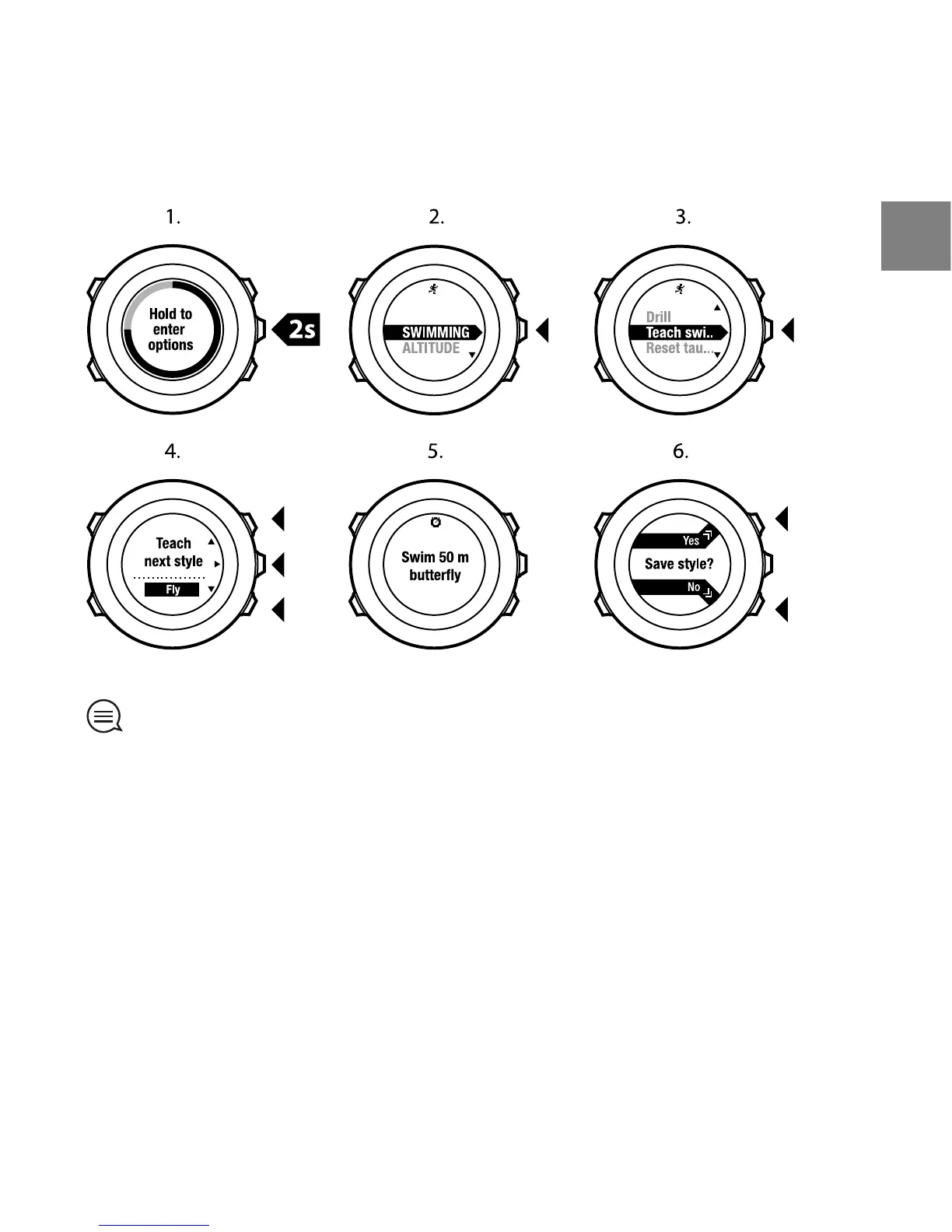TIP: You can exit teaching swimming styles any time by keeping [Next] pressed.