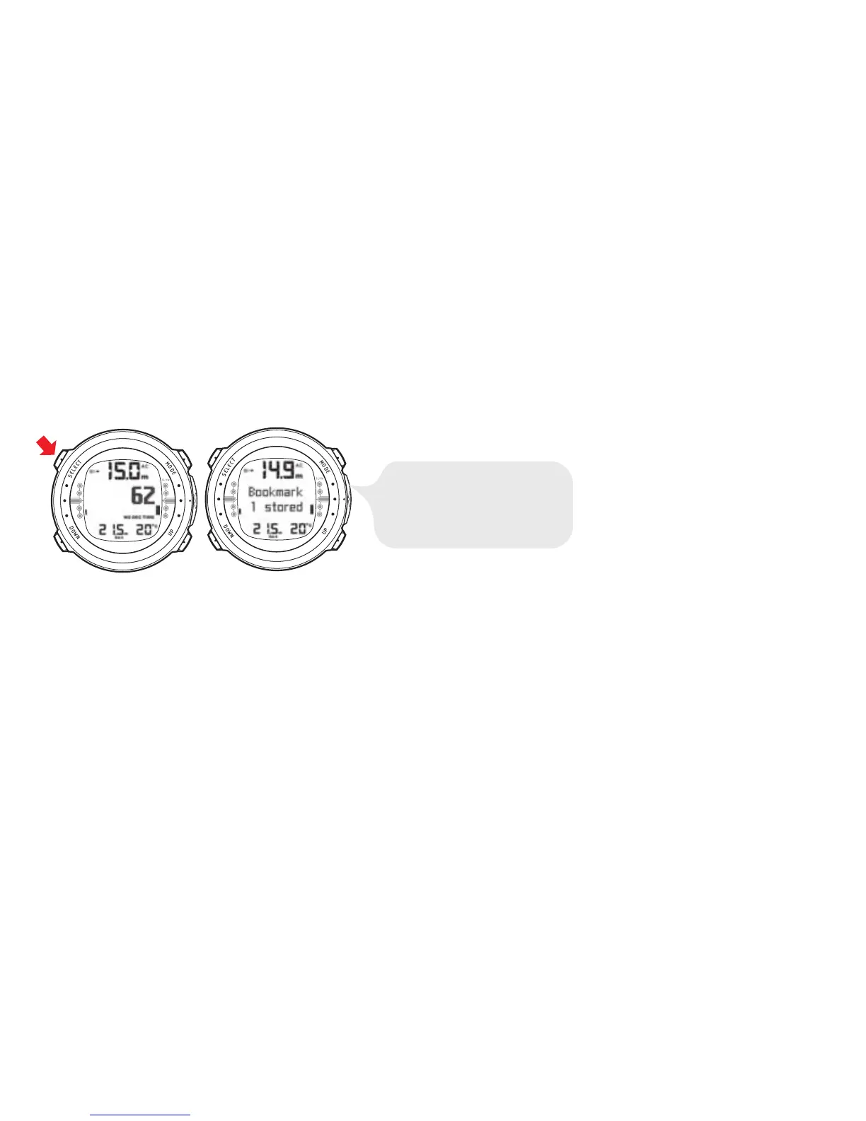 To make a bookmark in the profile memory during a dive, press the SELECT button.