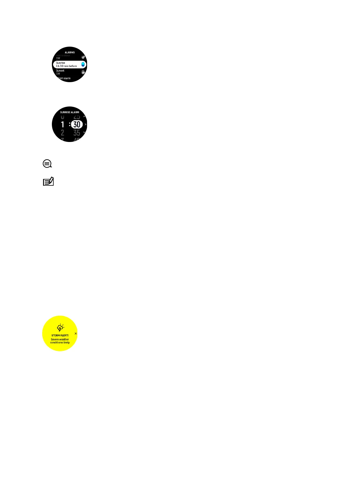 NOTE: Sunrise and sunset times and alarms require a GPS fix. The times are blank until