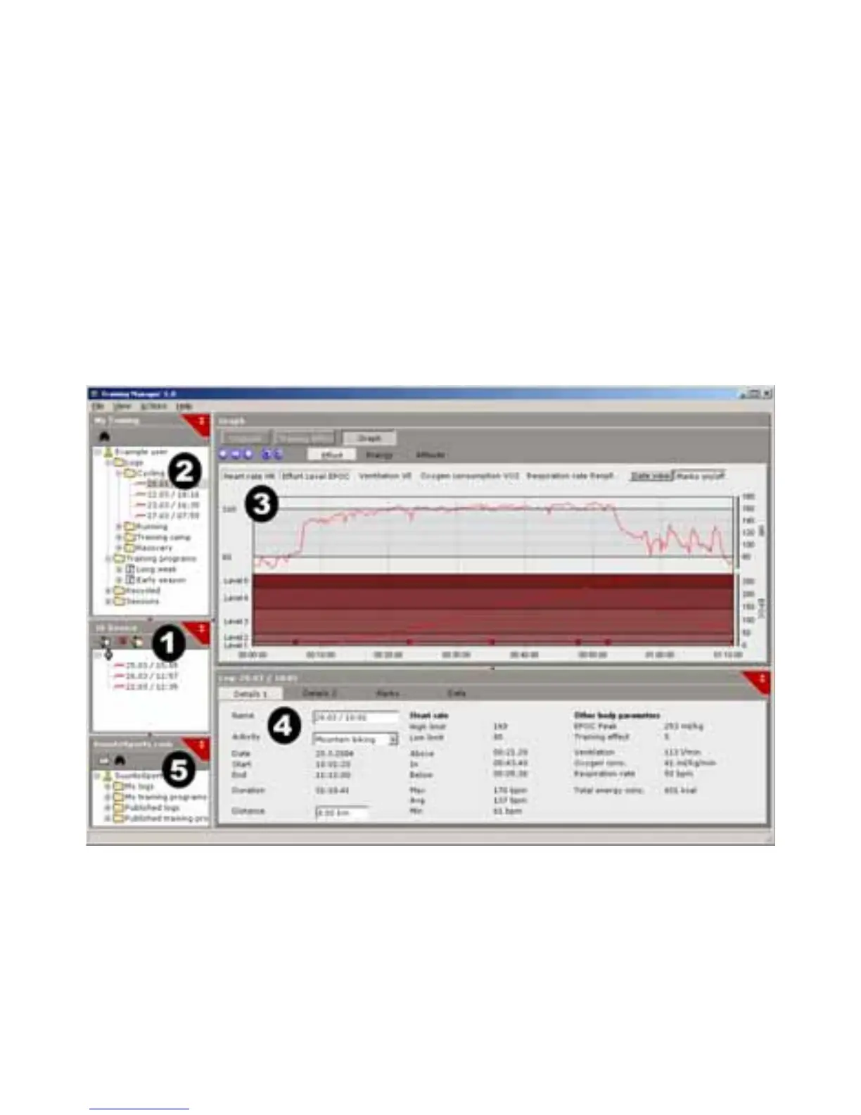 The Suunto Training Manager display is divided into five separate windows. These