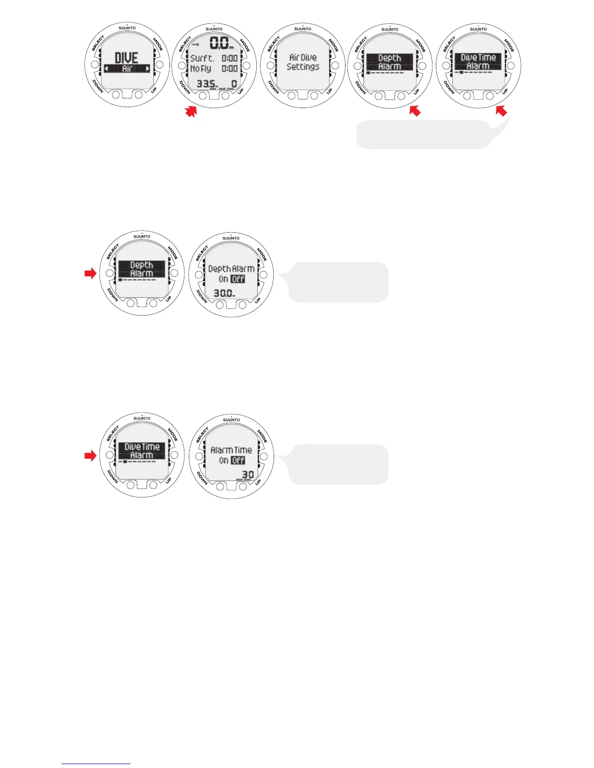 The depth alarm is factory-set to 30 m/131 ft, but you can adjust it according to your