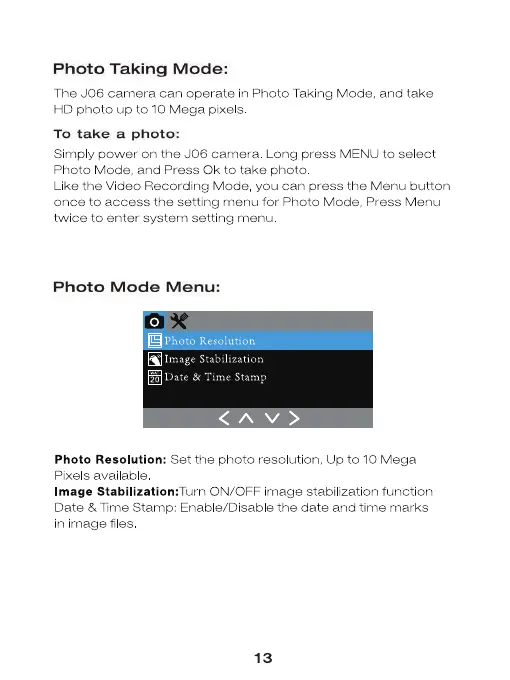 Photo Resolution: Set the photo resolution, Up to 10 Mega