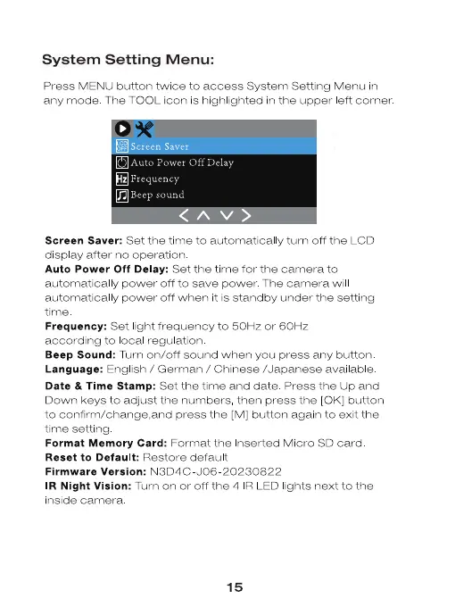 IR Night Vision: Turn on or Off the 4 R LED lights next to the