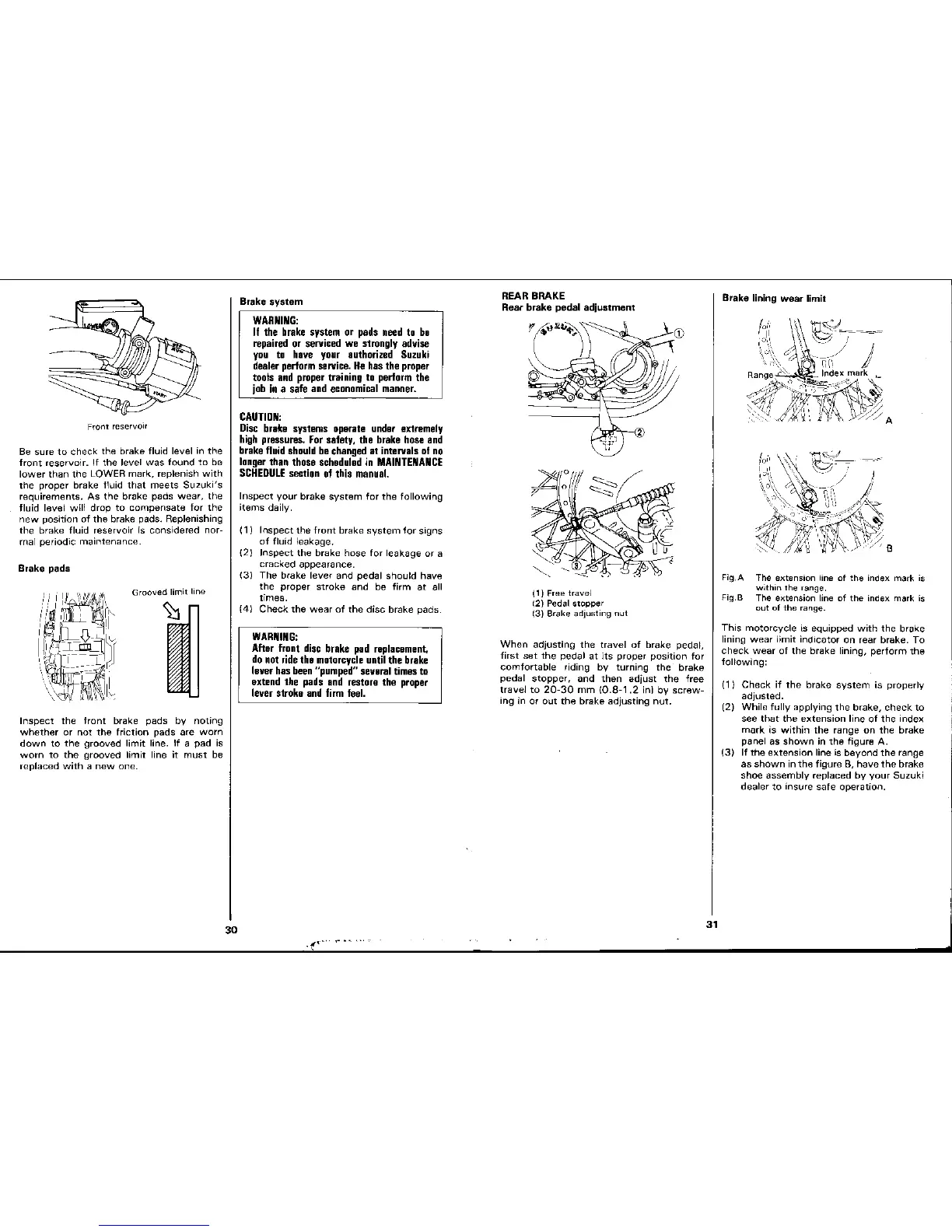 Suzuki 700 - Brake System Checks; Front Reservoir Fluid Level; Front Brake Pad Inspection; Rear Brake Adjustment