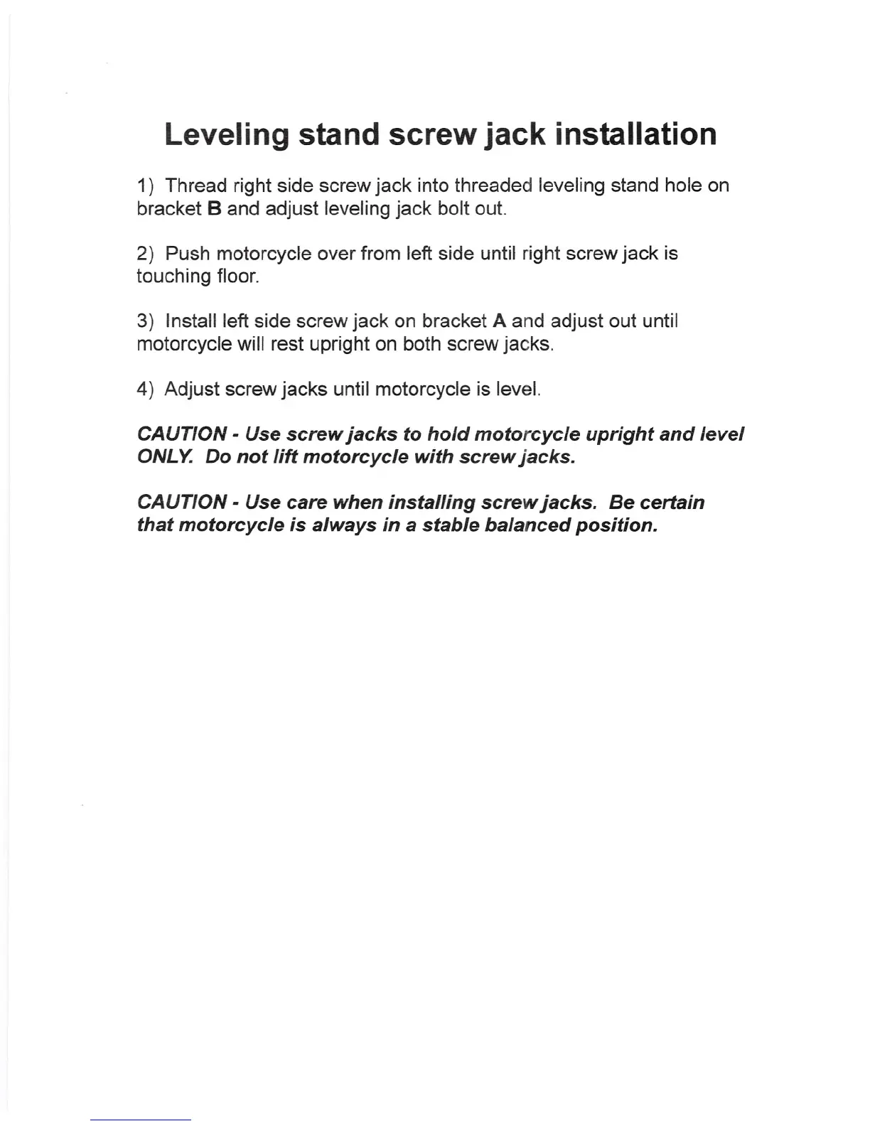 CAUTION -Use screw jacks to hold motorcycle upright and level