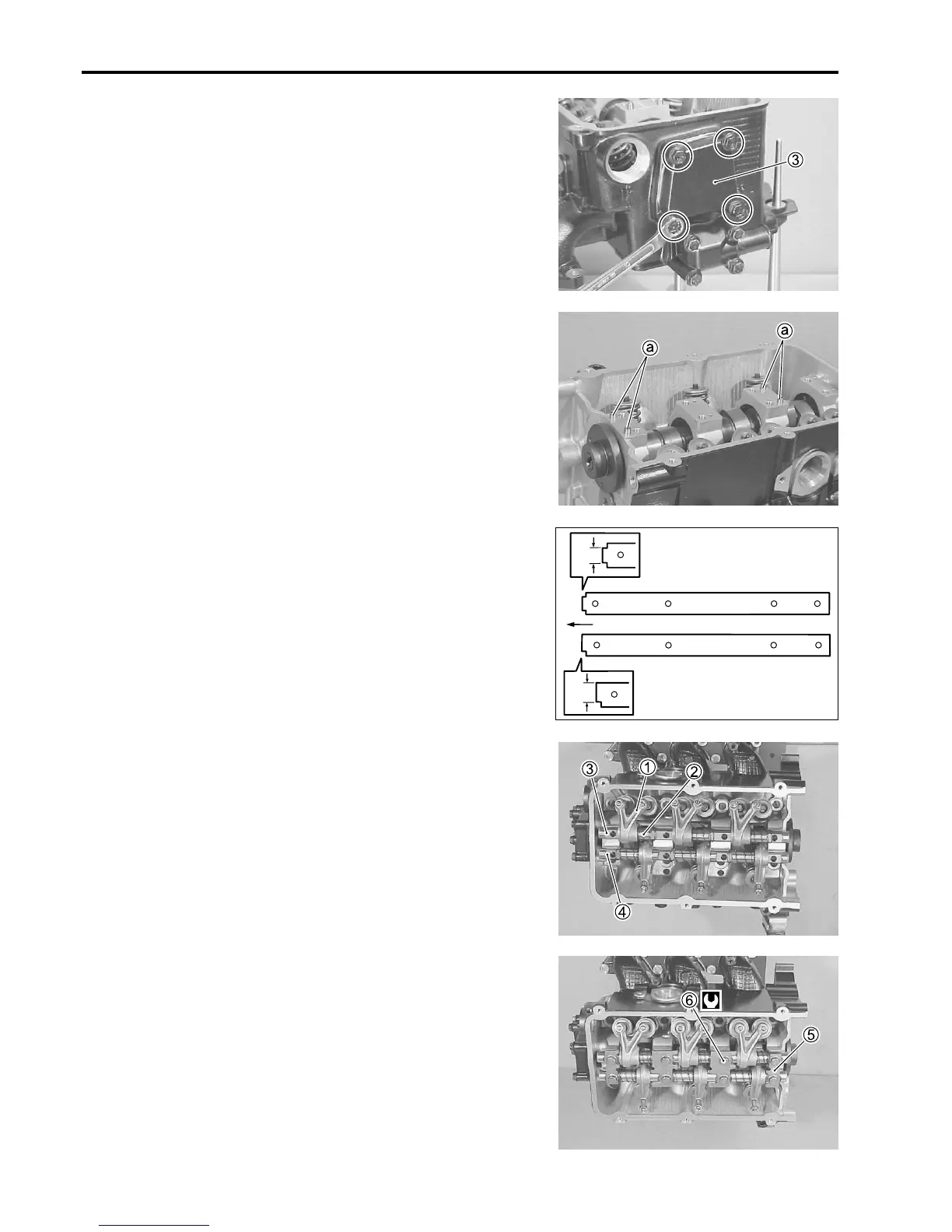 Install rocker arm shaft breackets 5, and bolts 6, then tighten