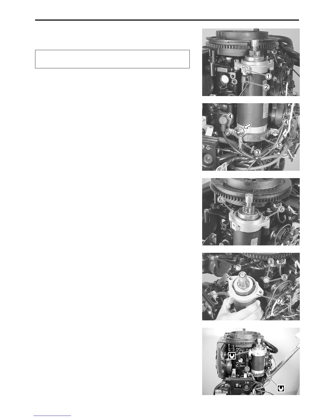 5. Remove two bolts 6 , starter motor 7 , spacers 8 and dowel