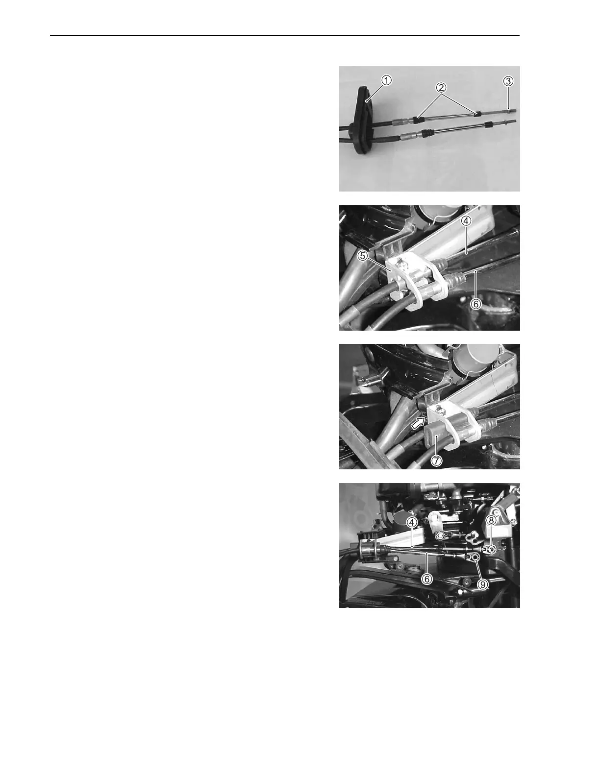 (2) Secure the shift cable 4 and throttle cable 6 in the cable