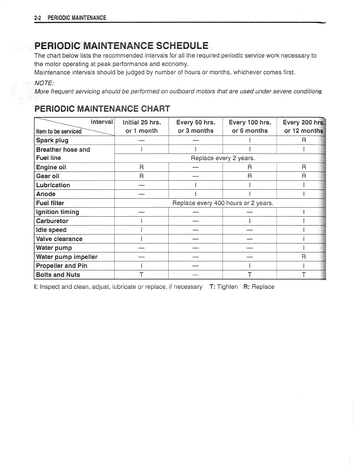 The chart below lists the recommended intervals for all the required periodic service work necessary to