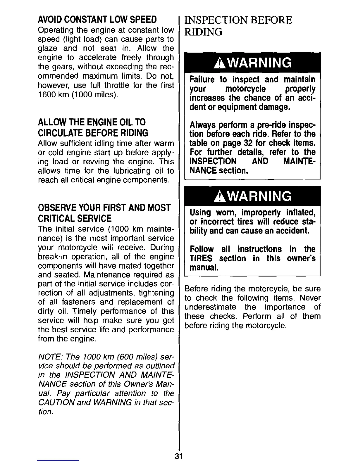 efore riding the motorcycle, be sure