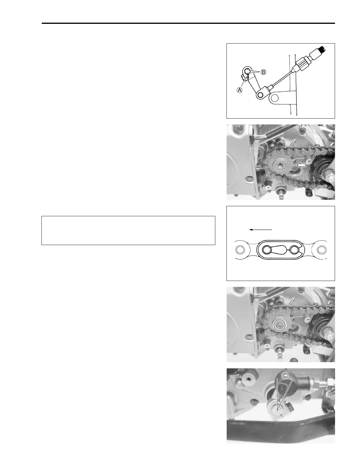 • Tighten the engine sprocket bolt to the specified torque.