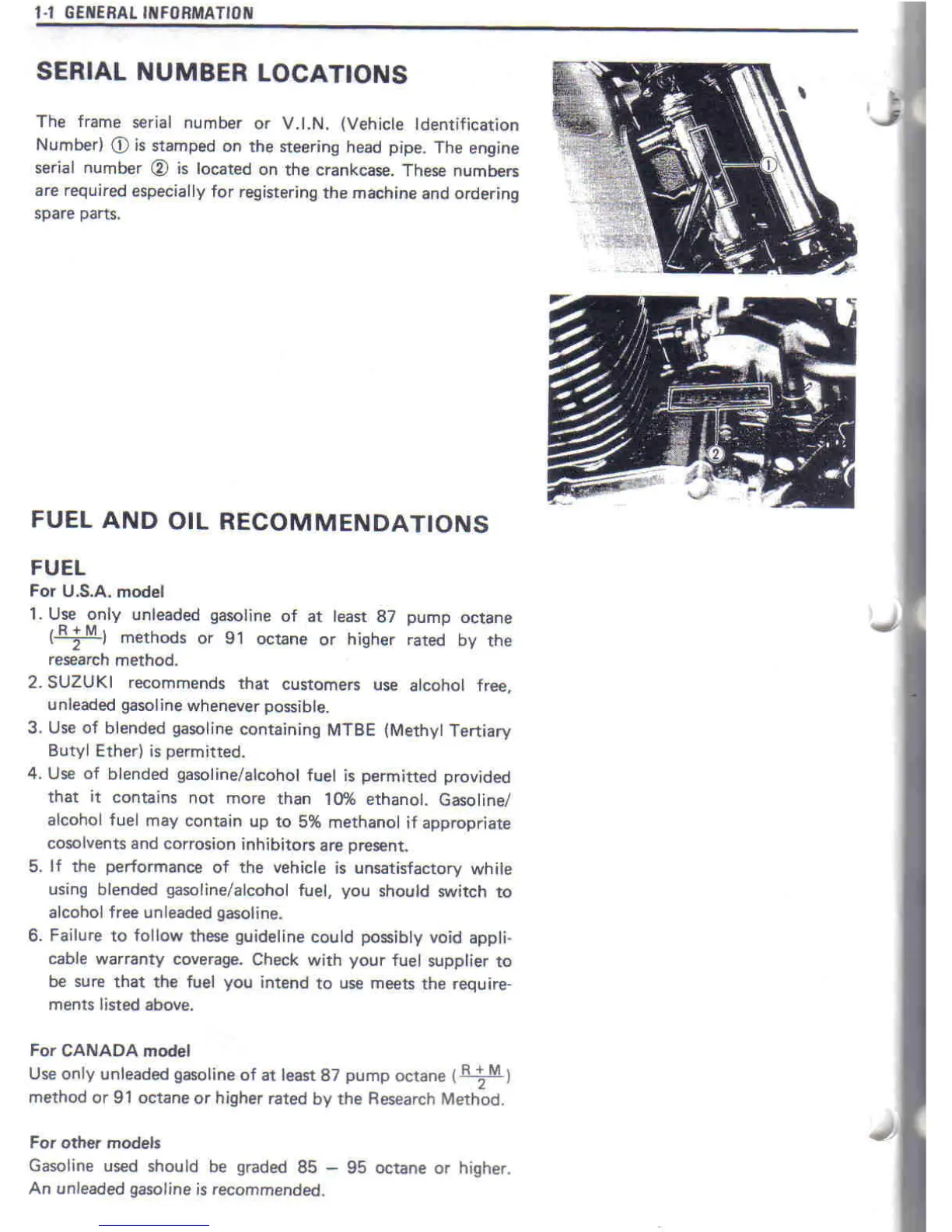 Suzuki DR650S - Serial Number Locations; Fuel and Oil Recommendations