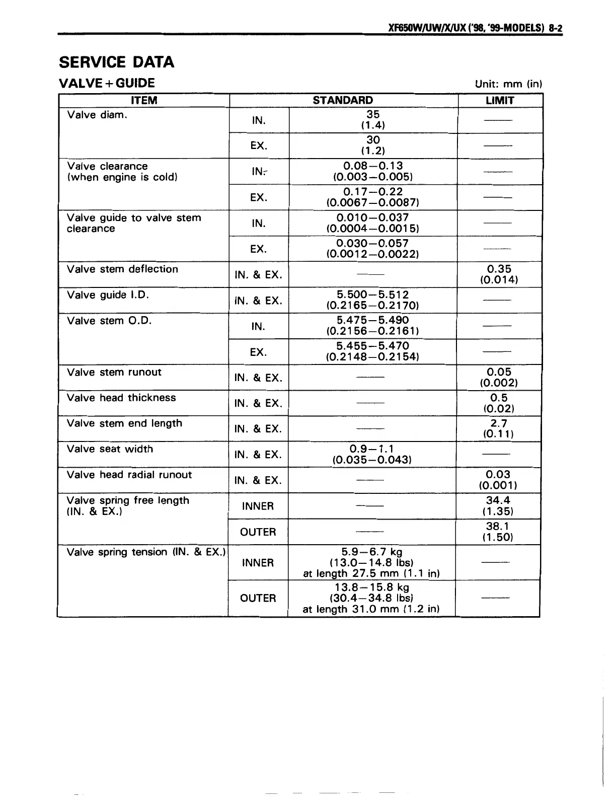 Suzuki freewind - XF650 W;UW;X;UX (98, 99-Models) Service Data - Valve+Guide