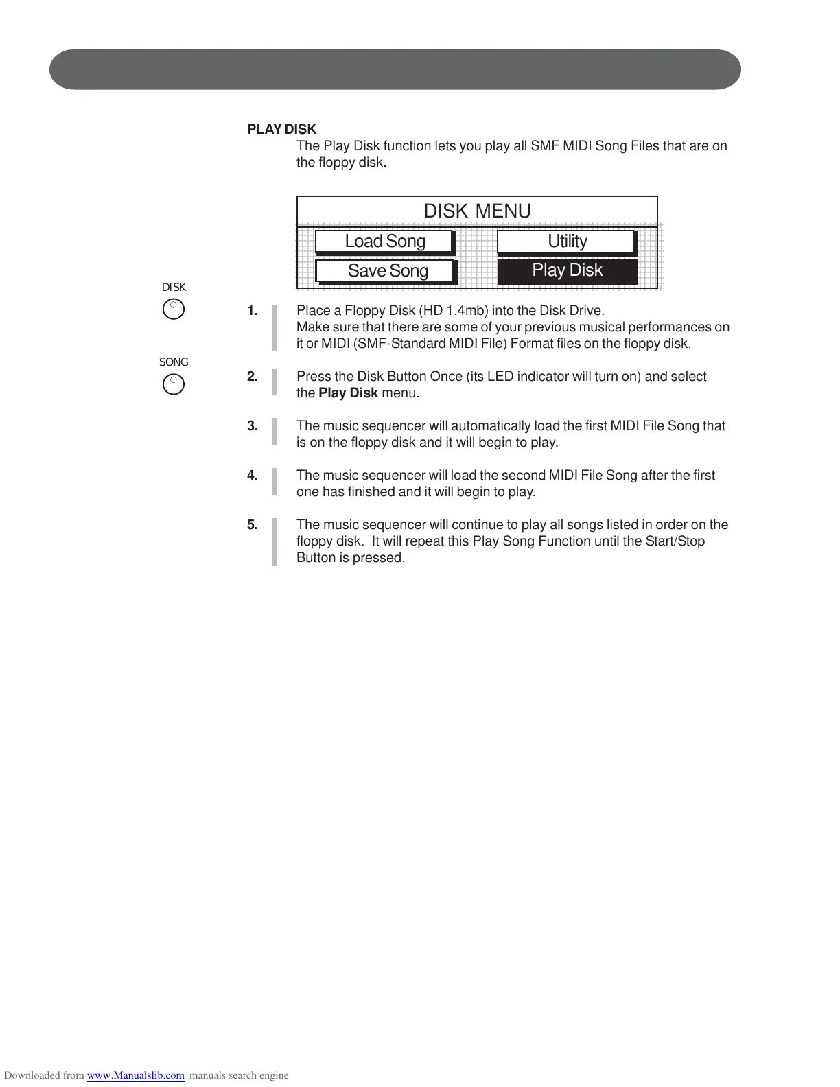 The Play Disk function lets you play all SMF MIDI Song Files that are on