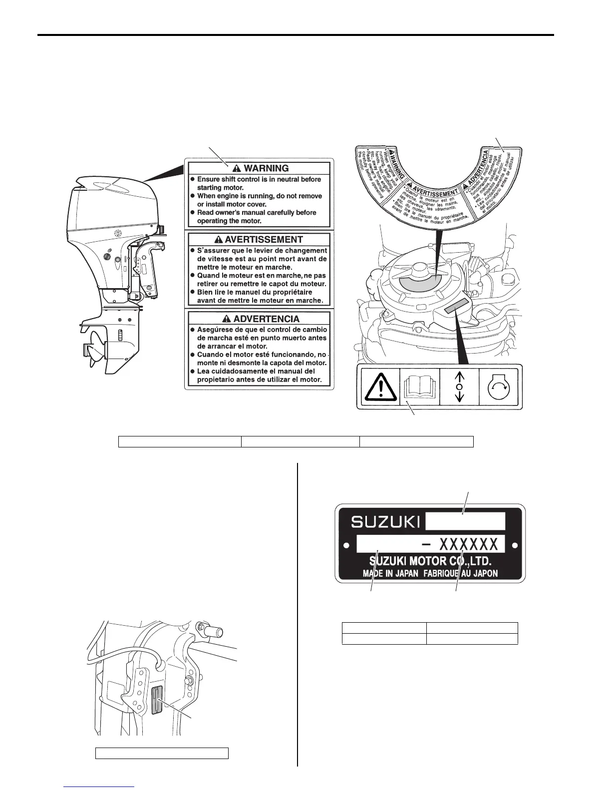 The figure shows main labels among others that are attached to outboard motor.