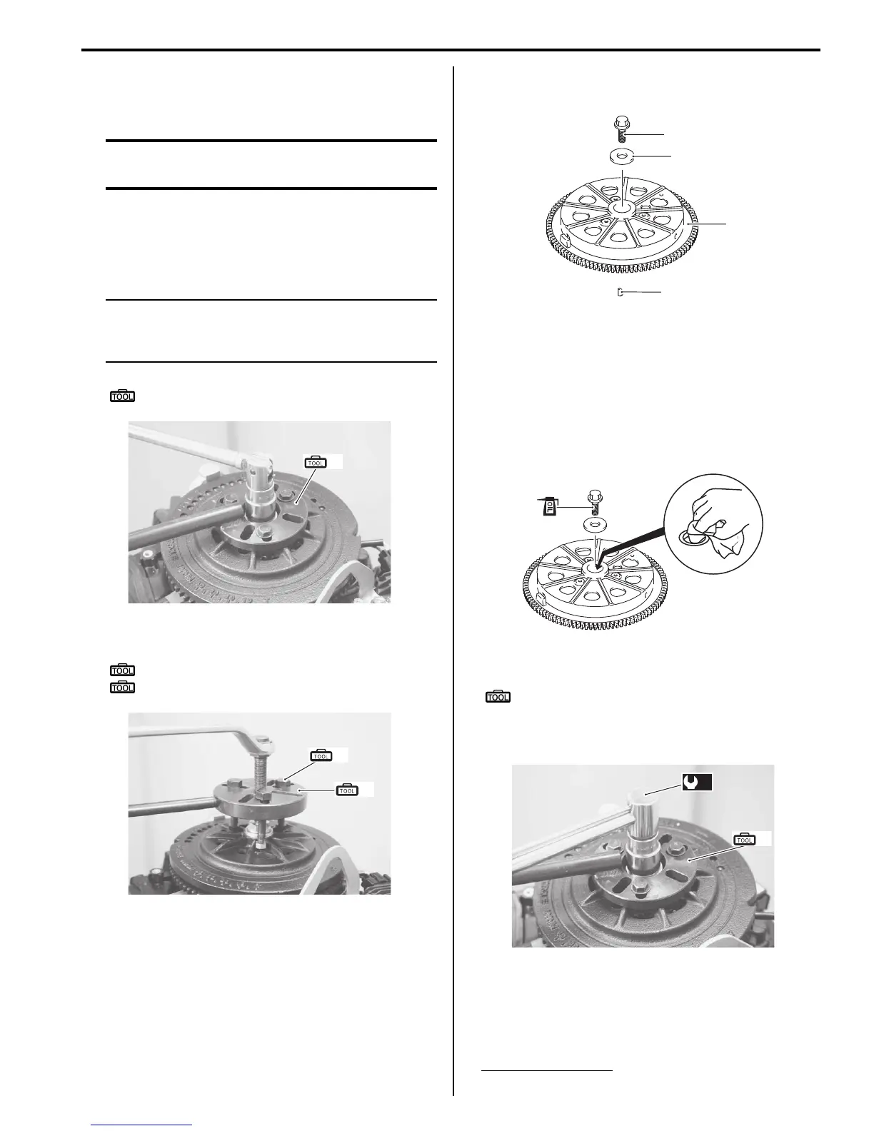 4) Remove the flywheel bolt (1), washer (2), flywheel