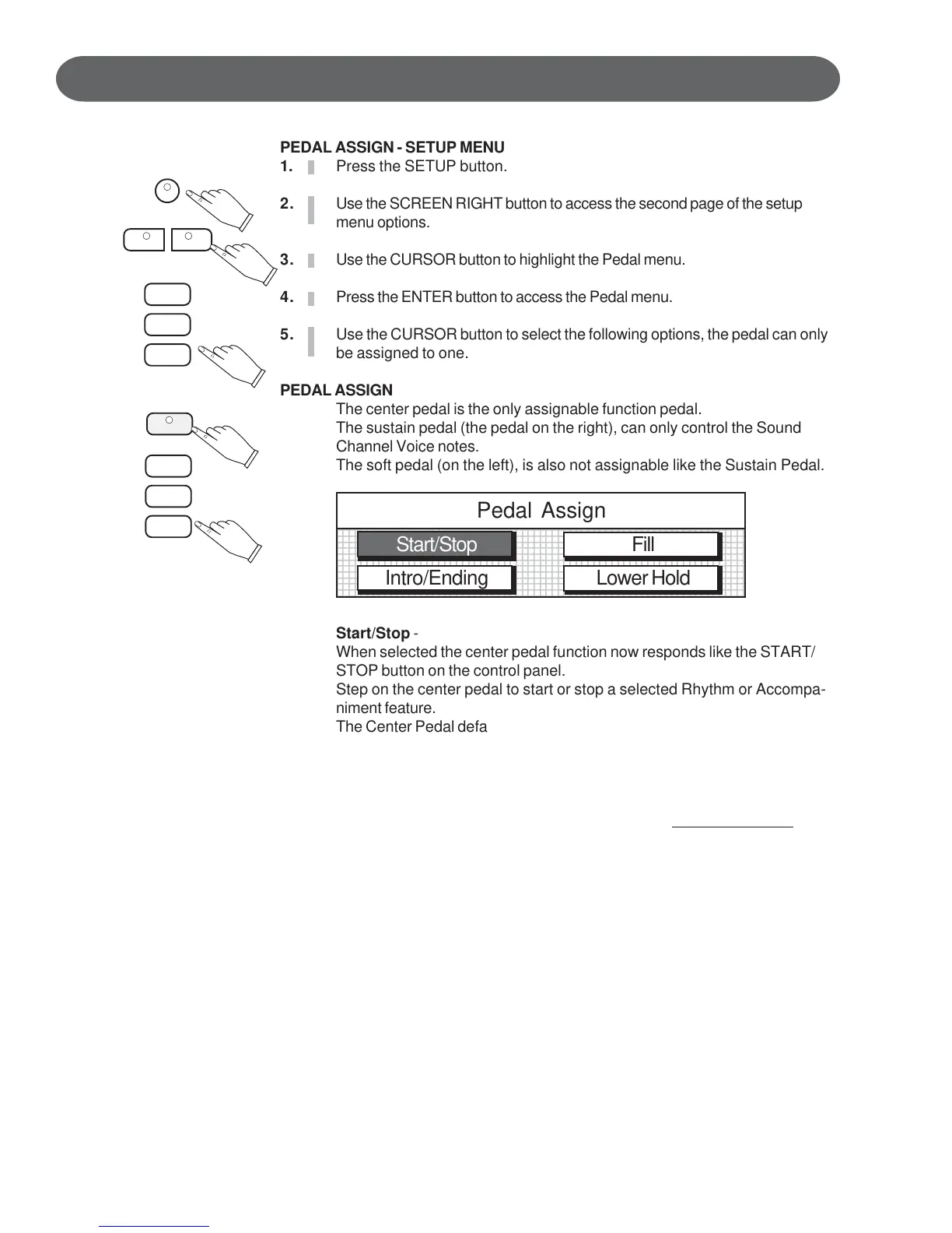 Step on the center pedal to start or stop a selected Rhythm or Accompa-