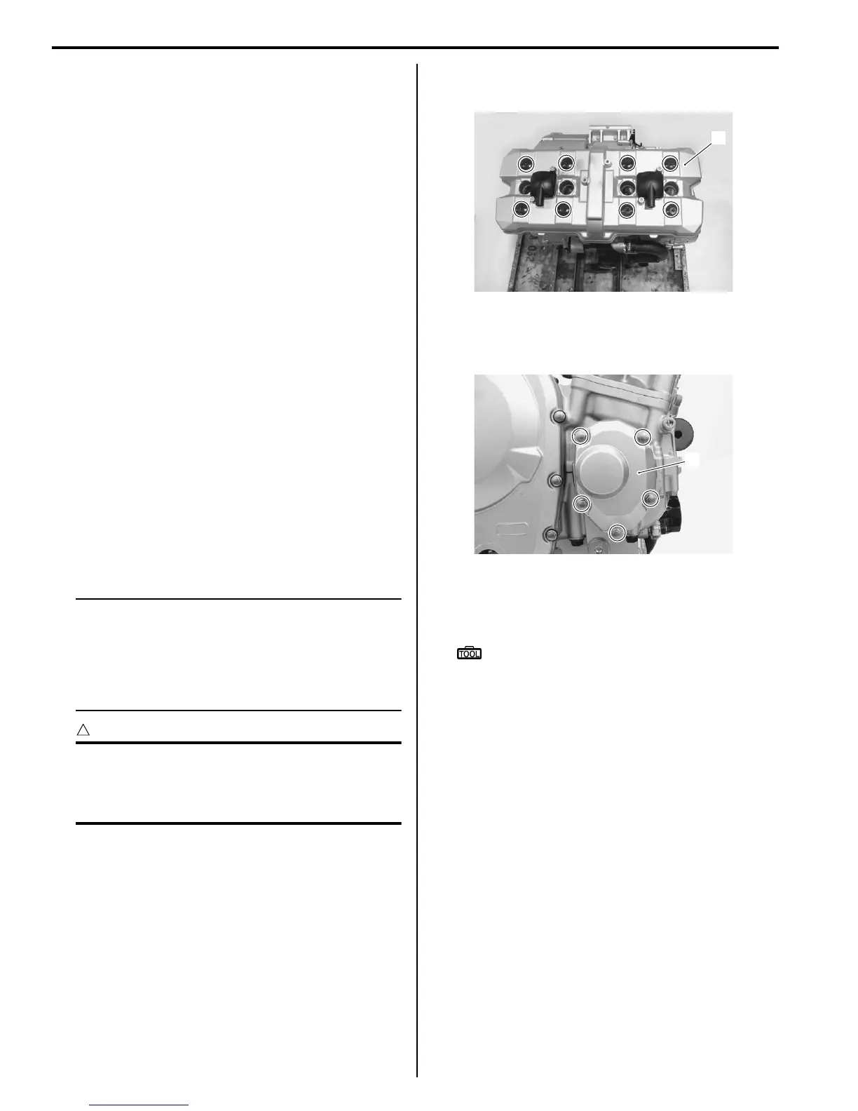 2) Remove all of the spark plugs. Refer to “Ignition Coil