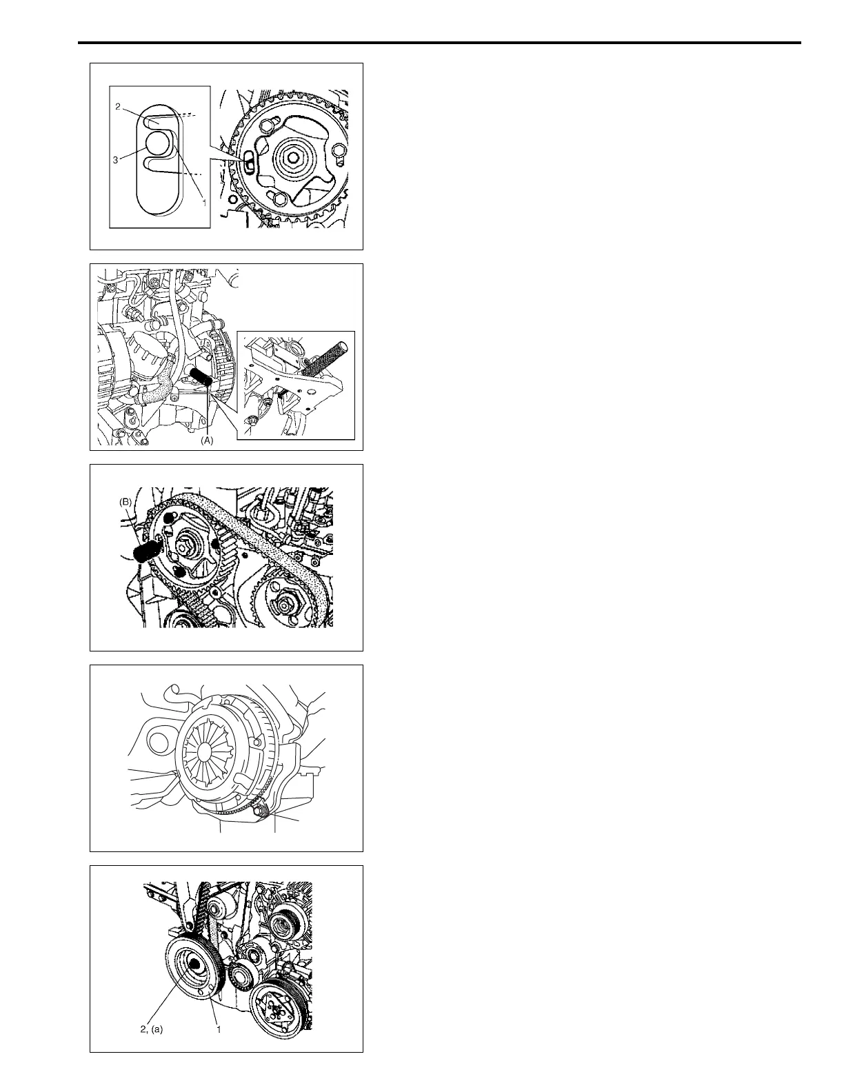 21) Check that special tool (B) inserts holes of timing belt pulley