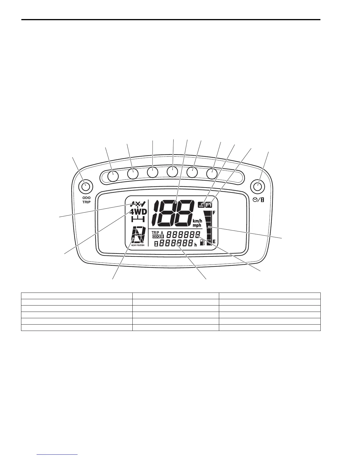 The LCDs indicate Speed, Odo / Trip A / Trip B, Fuel level, Diff-lock, 4WD, Gear position, Engine coolant temperature,