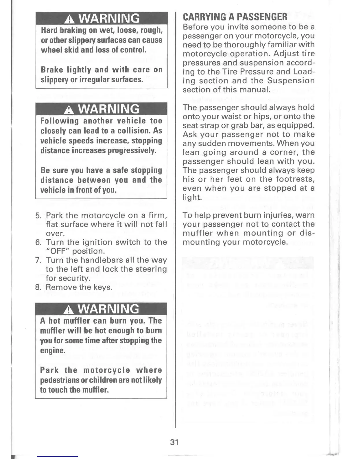 Suzuki LS650P - Passenger Safety and Parking; Carrying a Passenger Safely; Parking the Motorcycle Securely