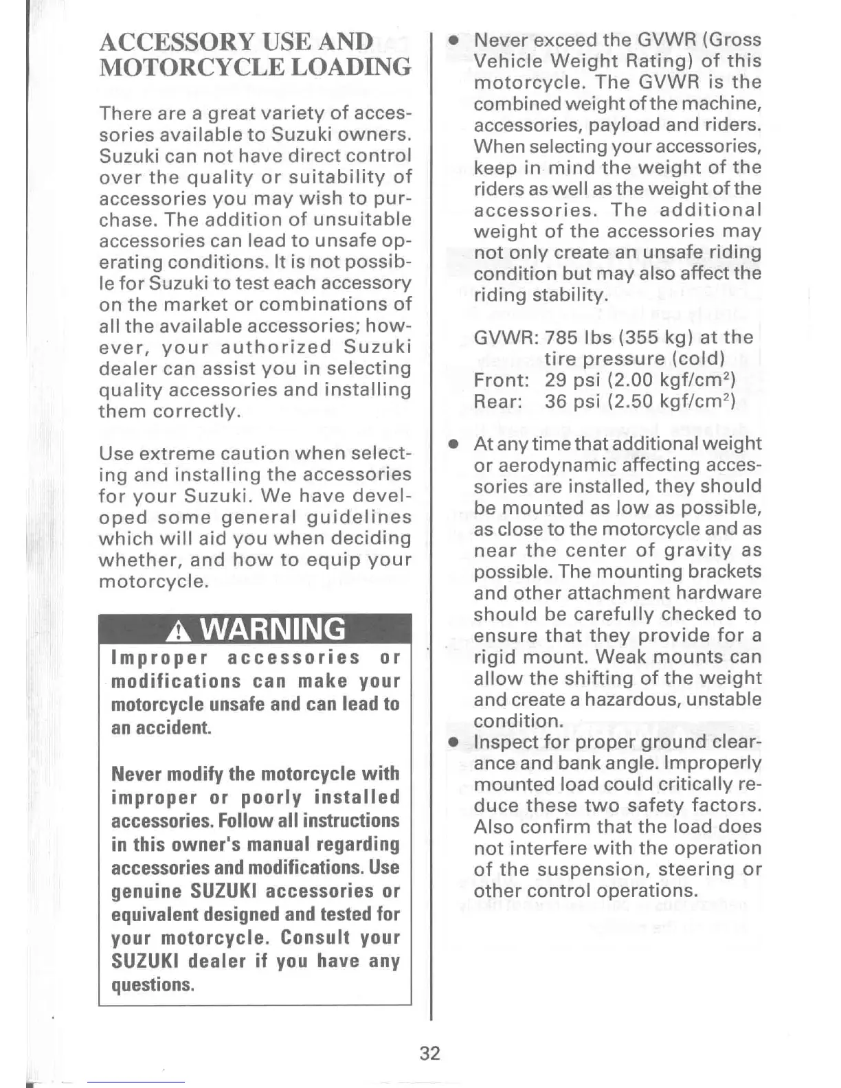 Suzuki LS650P - Accessories and Loading Guidelines; Accessory Use and Motorcycle Loading