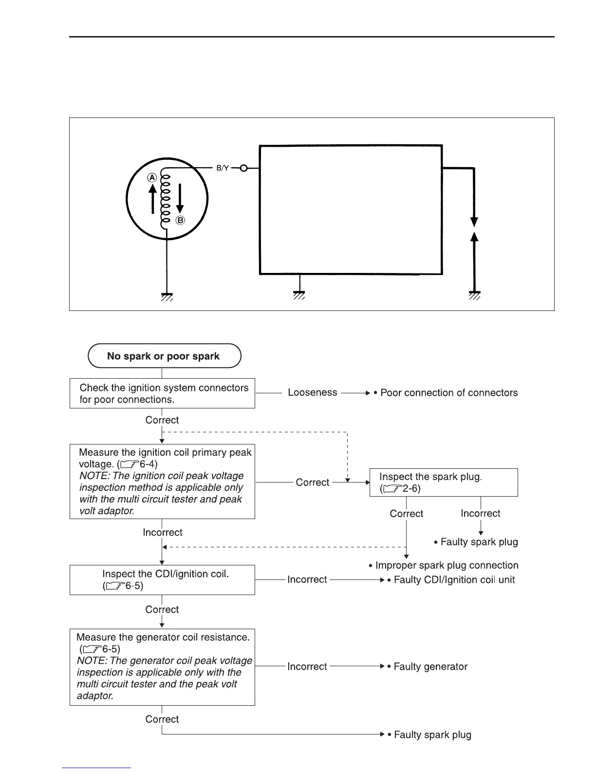 The ignition system is shown in the diagram below: namely the generator, CDI/Ignition coil unit and spark