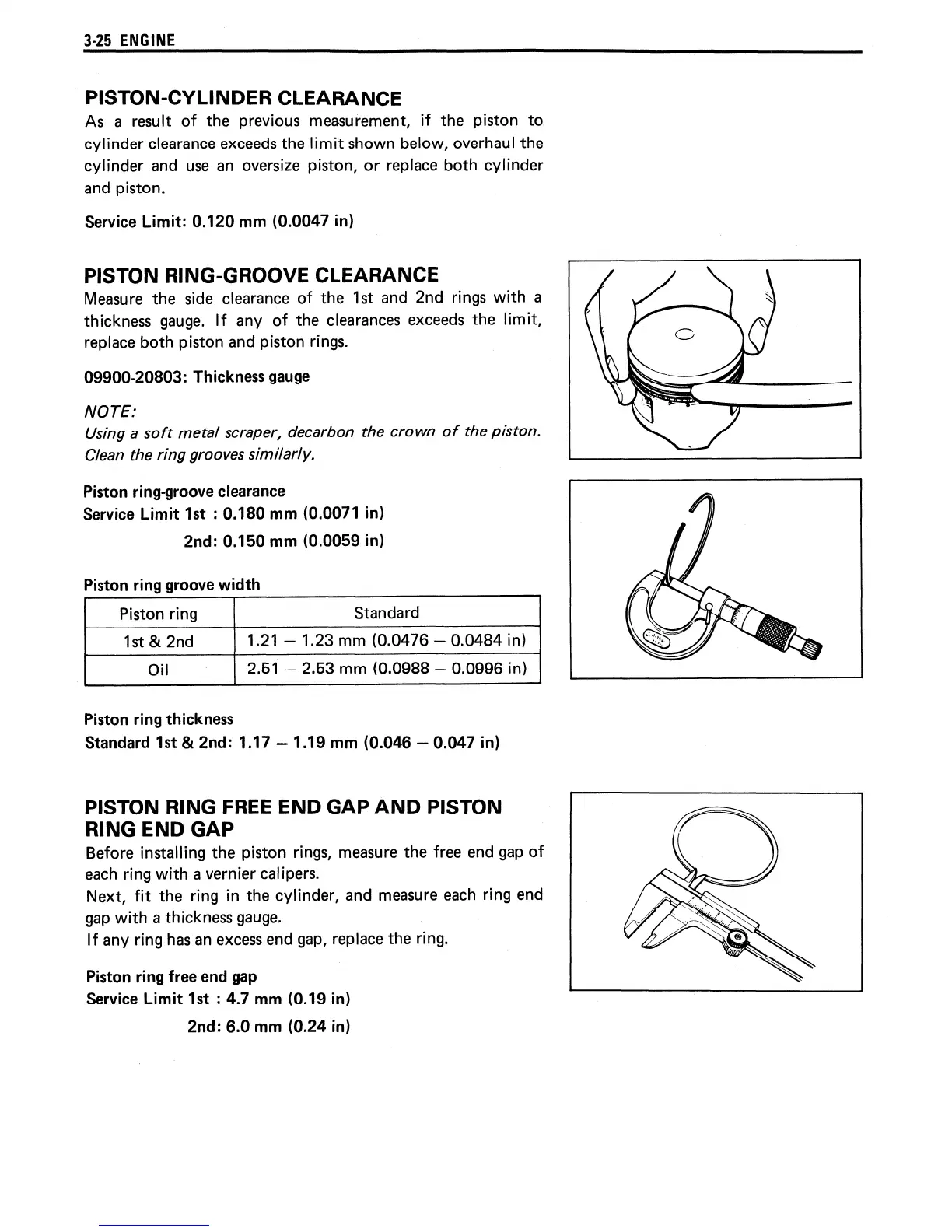 Suzuki LT160E - Piston-Cylinder Clearance; Piston Ring-Groove Clearance; Piston Ring Free End Gap and Piston Ring End Gap