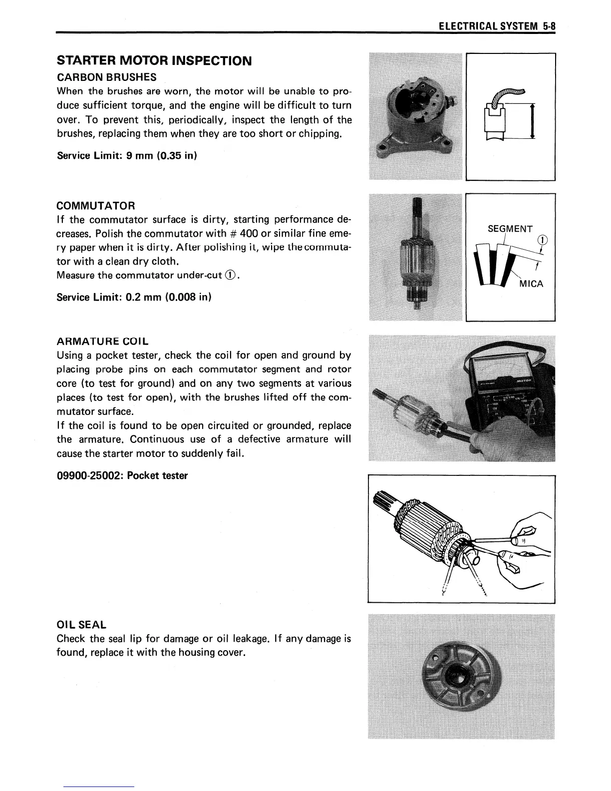 Suzuki LT160E - Armature Coil; Commutator; Carbon Brushes; Starter Motor Inspection