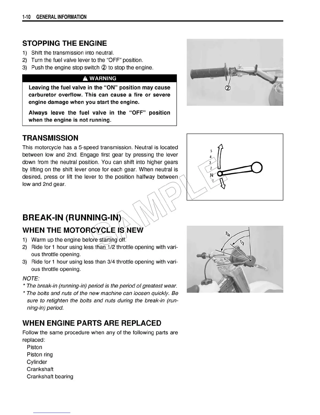 Suzuki RM 250 - Stopping the Engine; Transmission; Break-In (Running-In); When Engine Parts Are New;Replaced