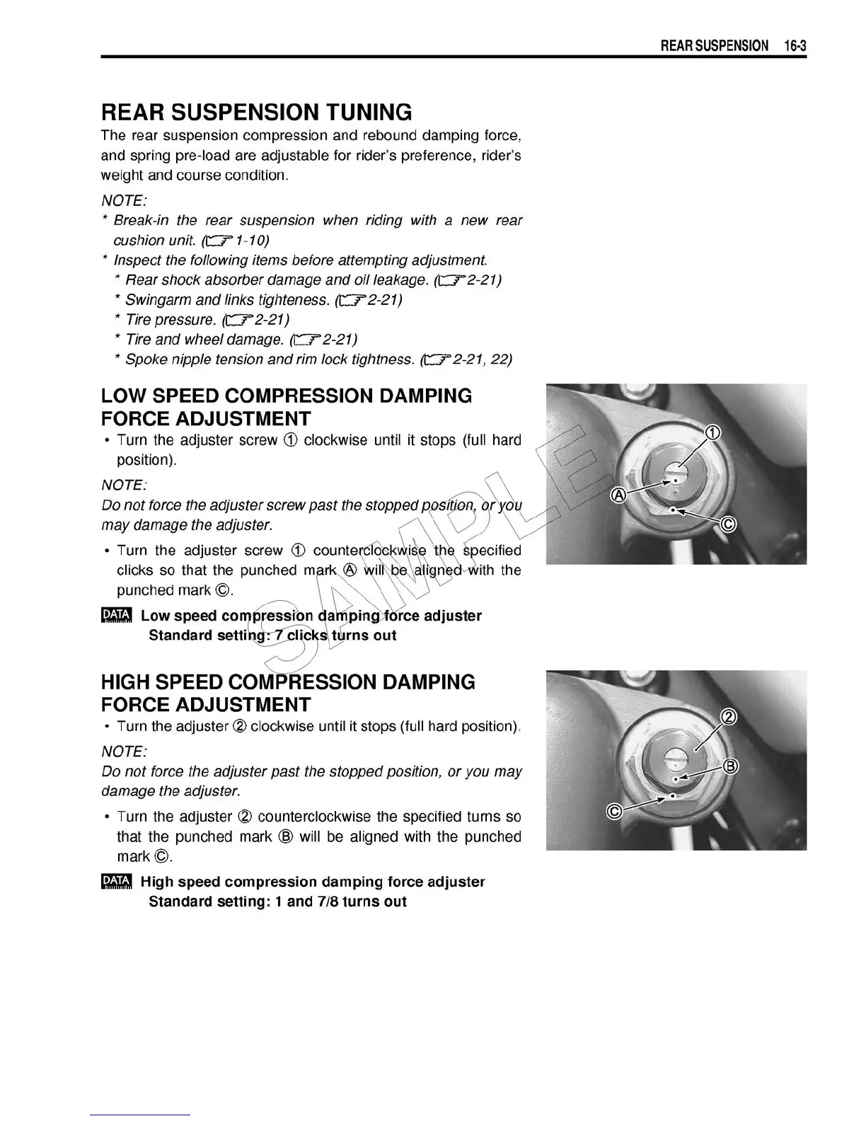 Suzuki RM 250 - Rear Suspension Tuning; Low Speed Compression Damping Force Adjustment; High Speed Compression Damping Force Adjustment