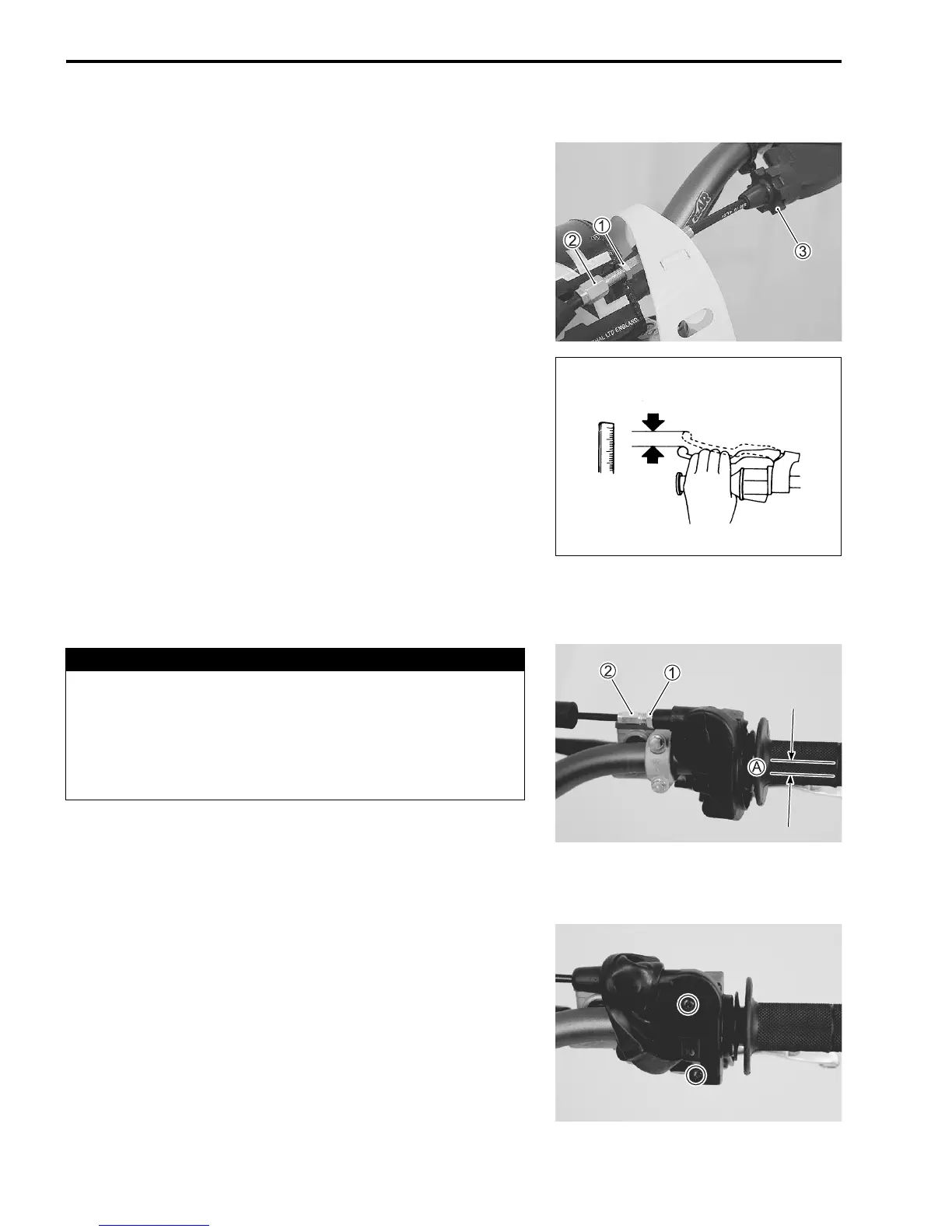 Throttle cable play A: 2.0 – 4.0 mm (0.08 – 0.16 in)