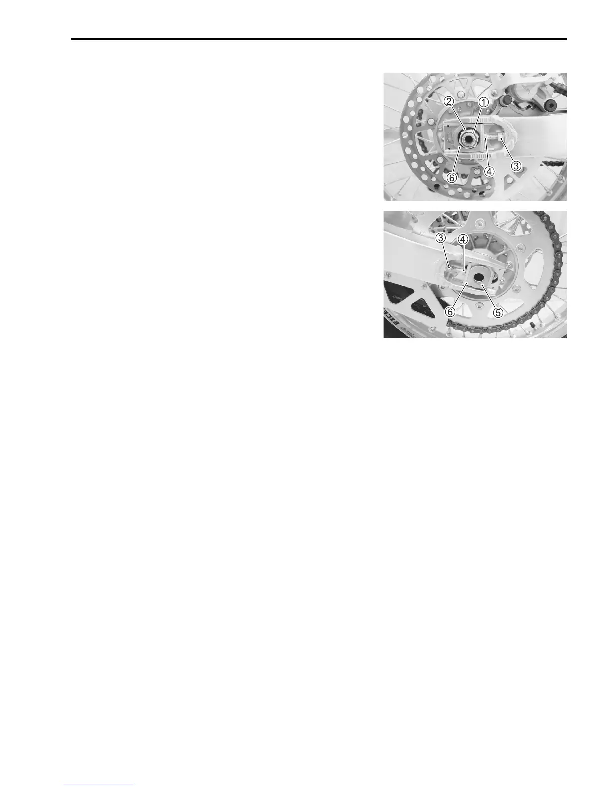 • Remove the rear axle shaft 5 and chain adjuster washers 6.
