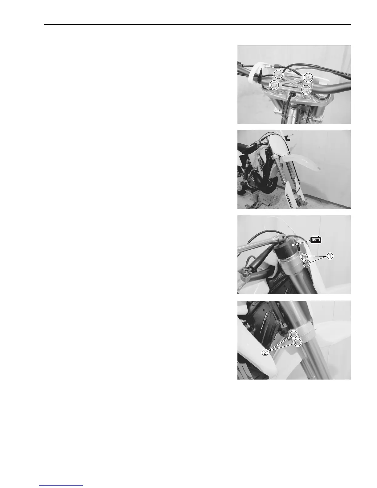 • Hold the fork body and loosen the fork lower clamp bolts 2.