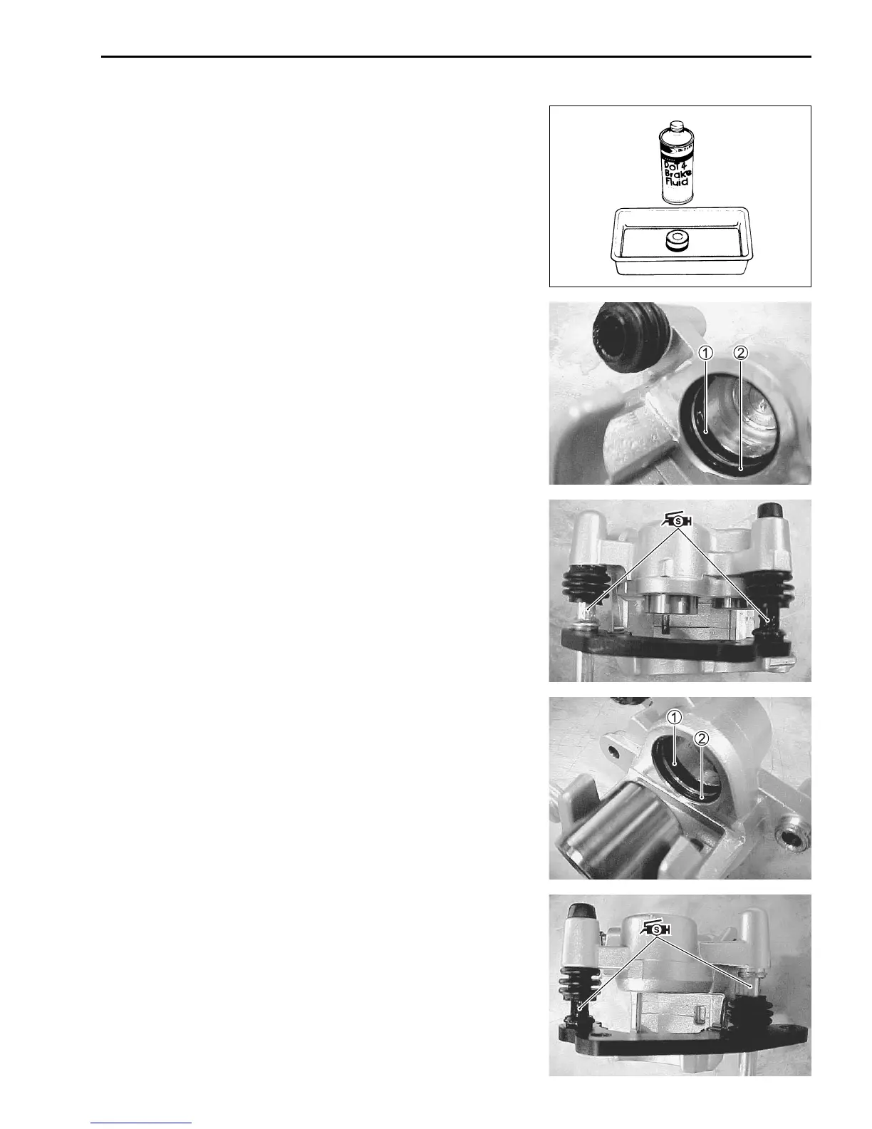 • Apply brake fluid to the piston seal 1 and dust seal 2, then