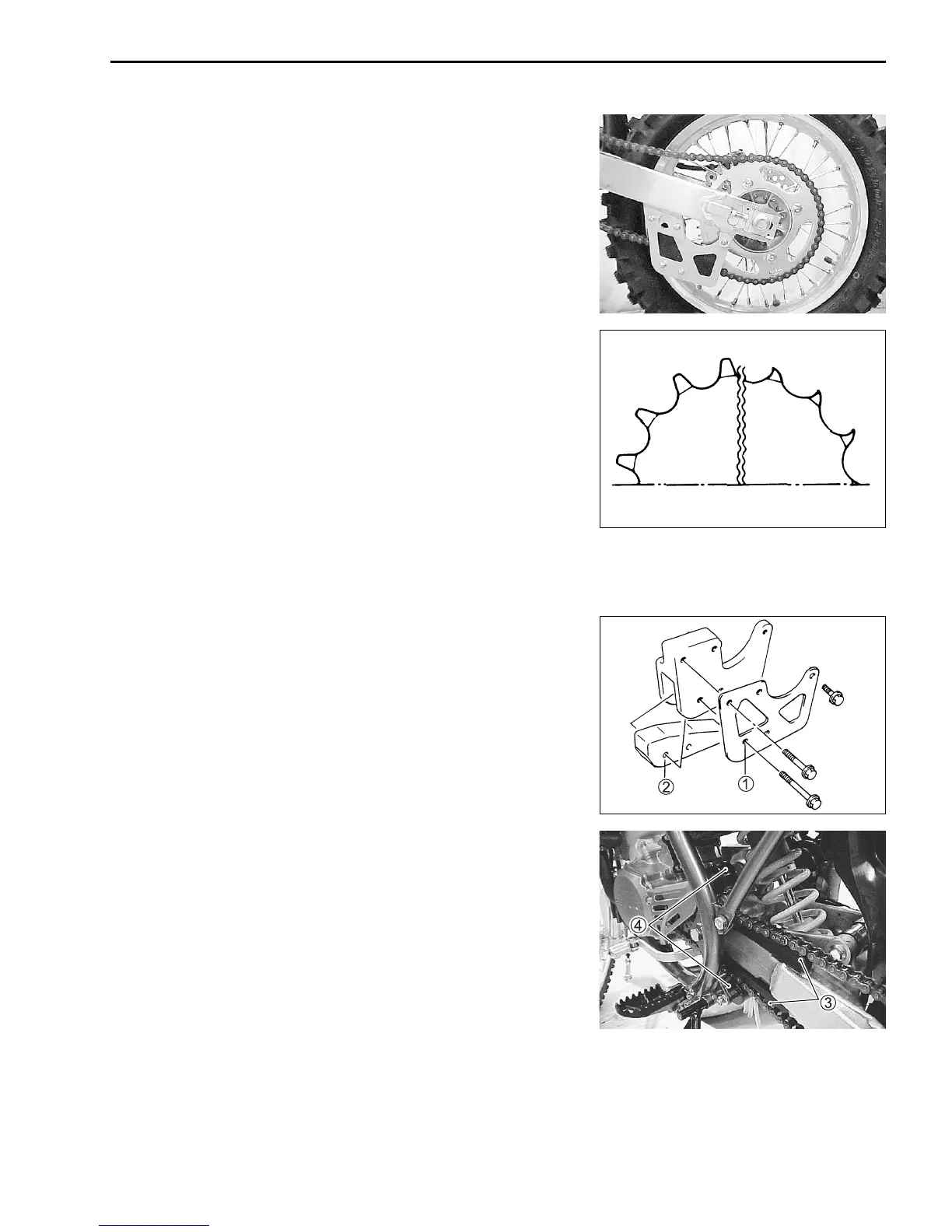 • Inspect the engine sprocket and rear sprocket for wear and
