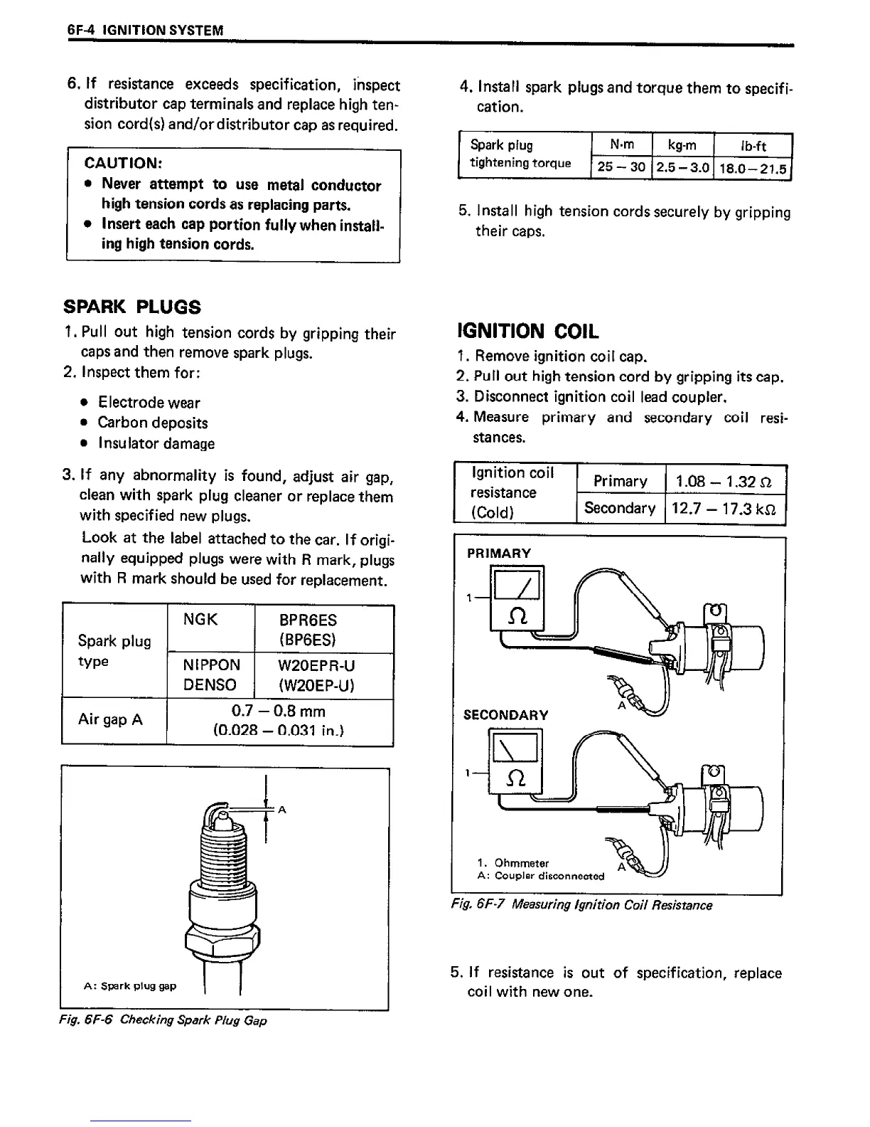 Suzuki SF413 - Spark Plugs; Ignition Coil; Checking Spark Plug Gap; Measuring Ignition Coil Resistance