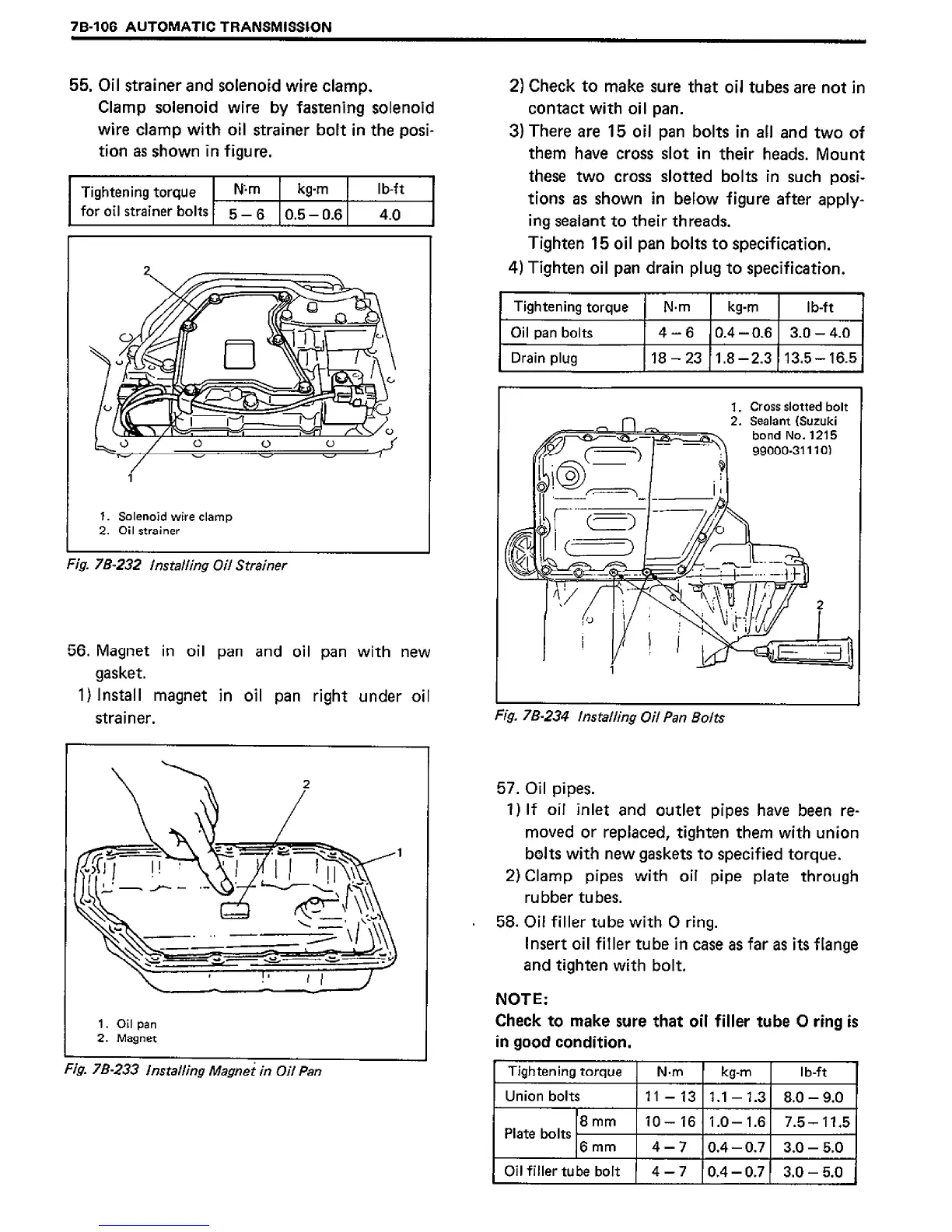 Suzuki SF413 - Installing Oil Strainer; Installing Oil Pan Bolts; Installing Magnet in Oil Pan