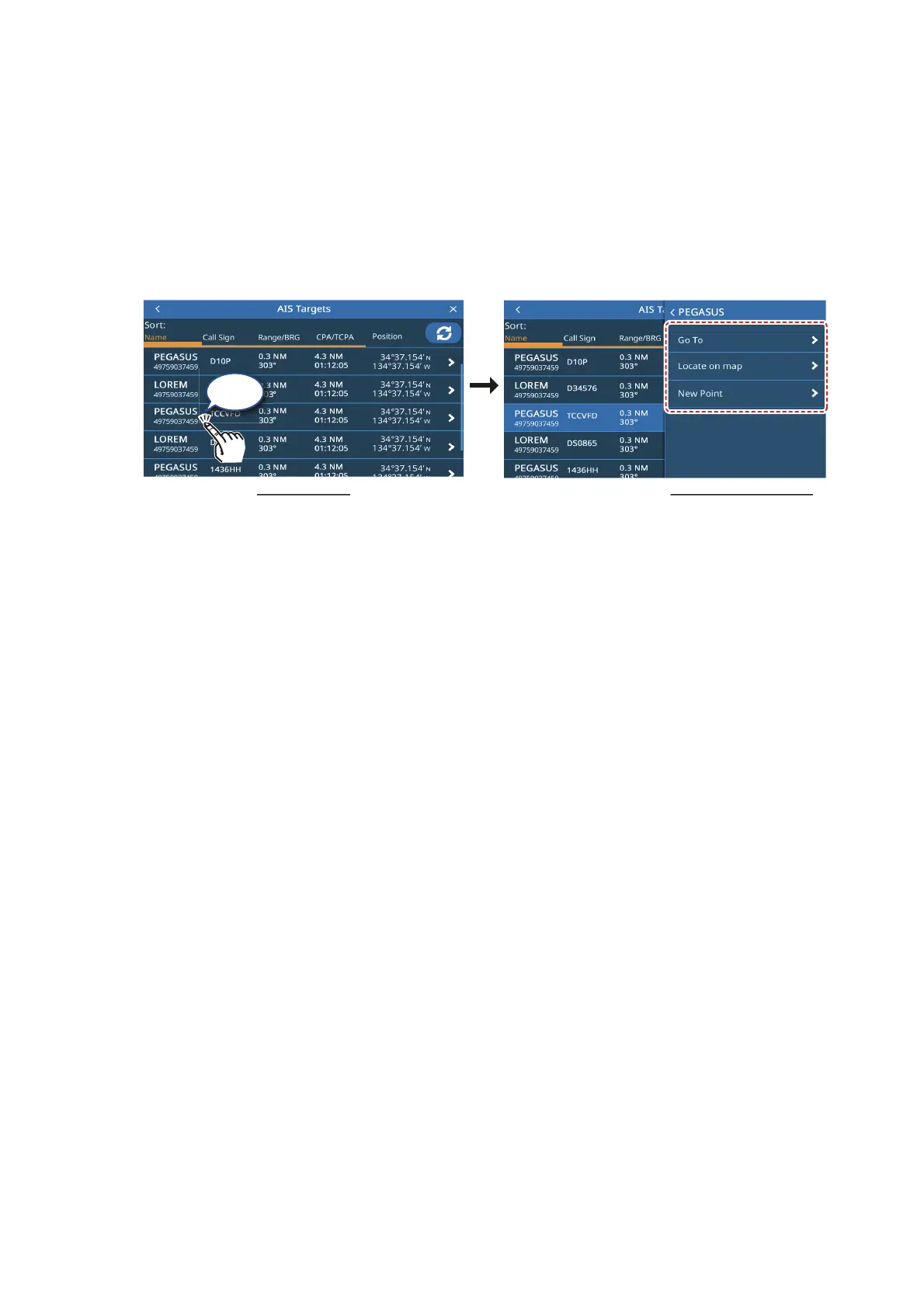 You can tap an AIS target in the list to show the sub menu.