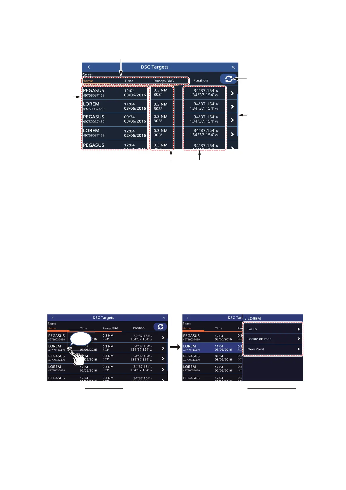 • [Range/BRG]: Sorts the list by range, in ascending order of distance from own ship.