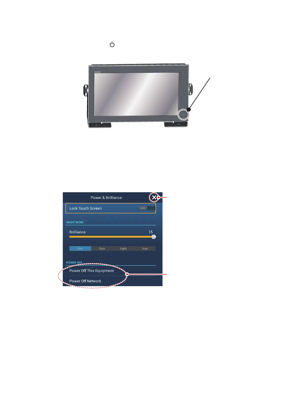 To turn off the power, tap the power switch to show the [Power & Brilliance] window.