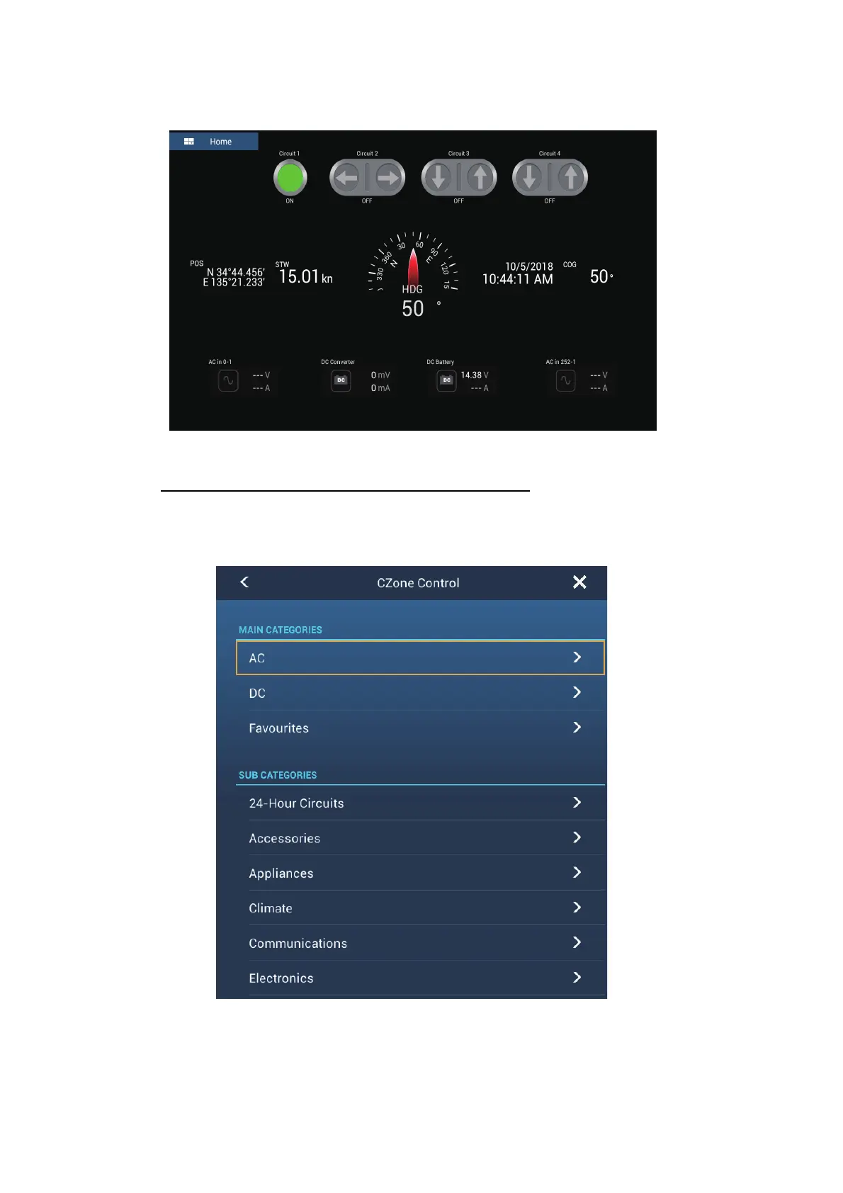 2. Tap [CZone Control] to show the following menu.