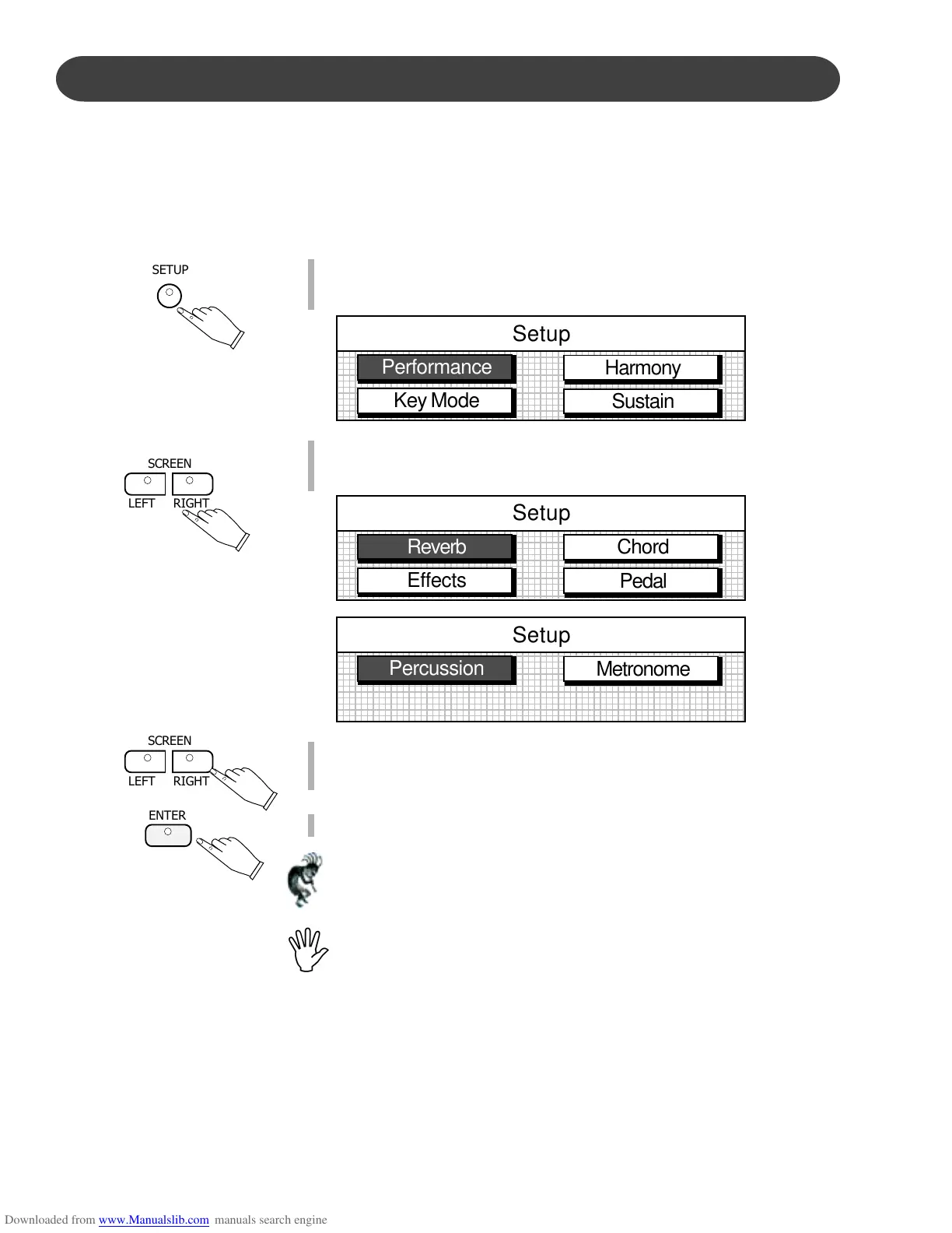 The SETUP button will access menus for Performance, Harmony, Key Mode, Sustain, Reverb, Chord