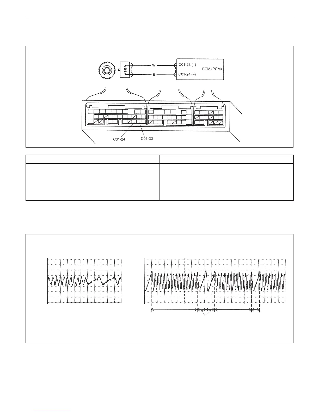 Connect oscilloscope between terminals C01-23 (+) and C01-24 (–) of ECM (PCM) connector connected to ECM