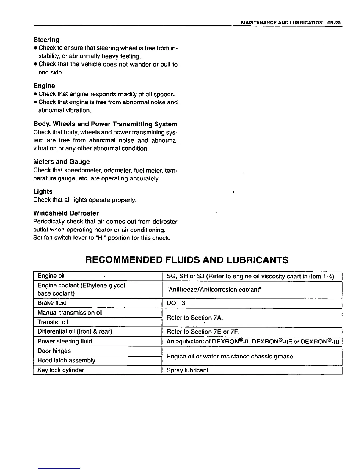 Suzuki VITARA - Recommended Fluids and Lubricants; Steering Check; Engine Check; Body, Wheels and Power Transmitting System Check