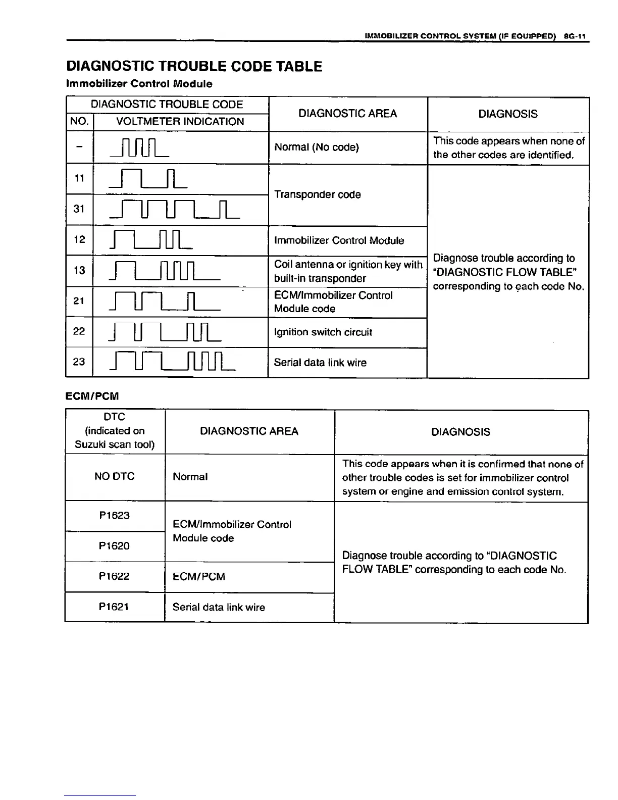 Suzuki VITARA - Diagnostic Trouble Code Table - Immobilizer Control Module; Diagnostic Trouble Code Table - ECM;PCM