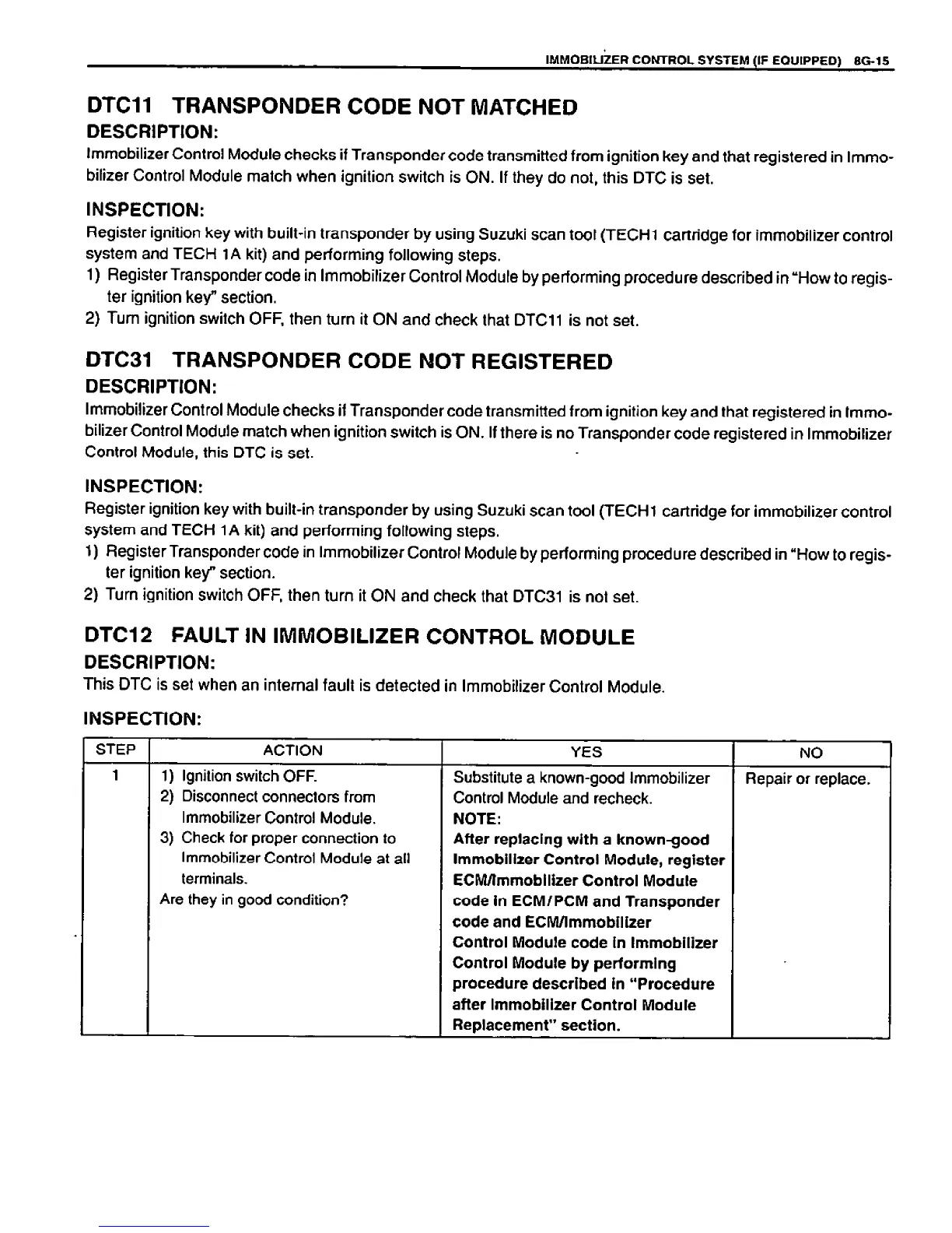Suzuki VITARA - DTC11 Transponder Code Not Matched; DTC31 Transponder Code Not Registered; DTC12 Fault in Immobilizer Control Module