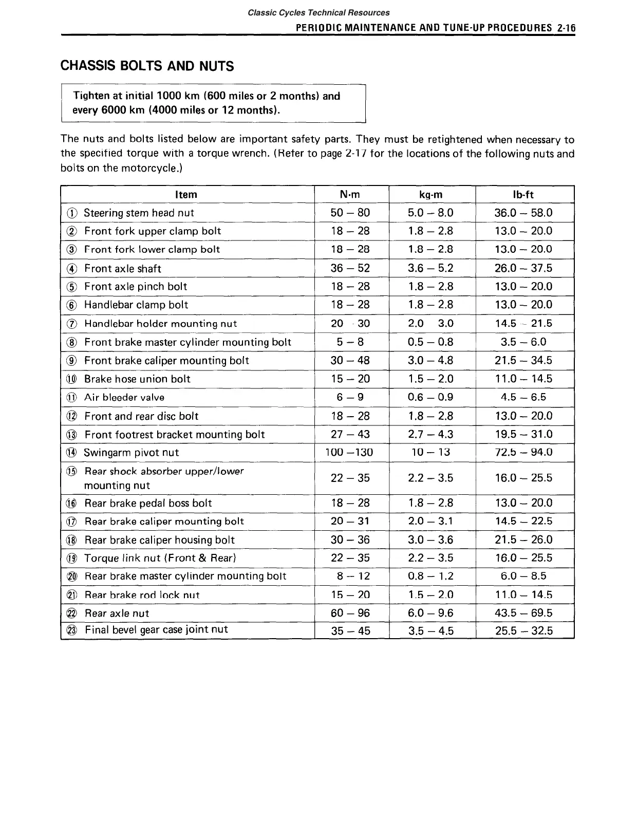 the specified torque with a torque wrench. (Refer to page 2-l 7 for the locations of the following nuts and